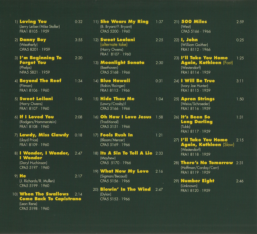 Elvis can be heard fooling around with 'Santa Claus Is Back In Town' after 'Danny Boy" (track 2), although it is not listed on the CD cover.