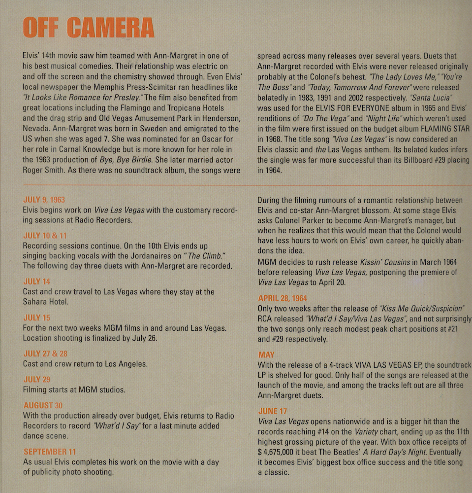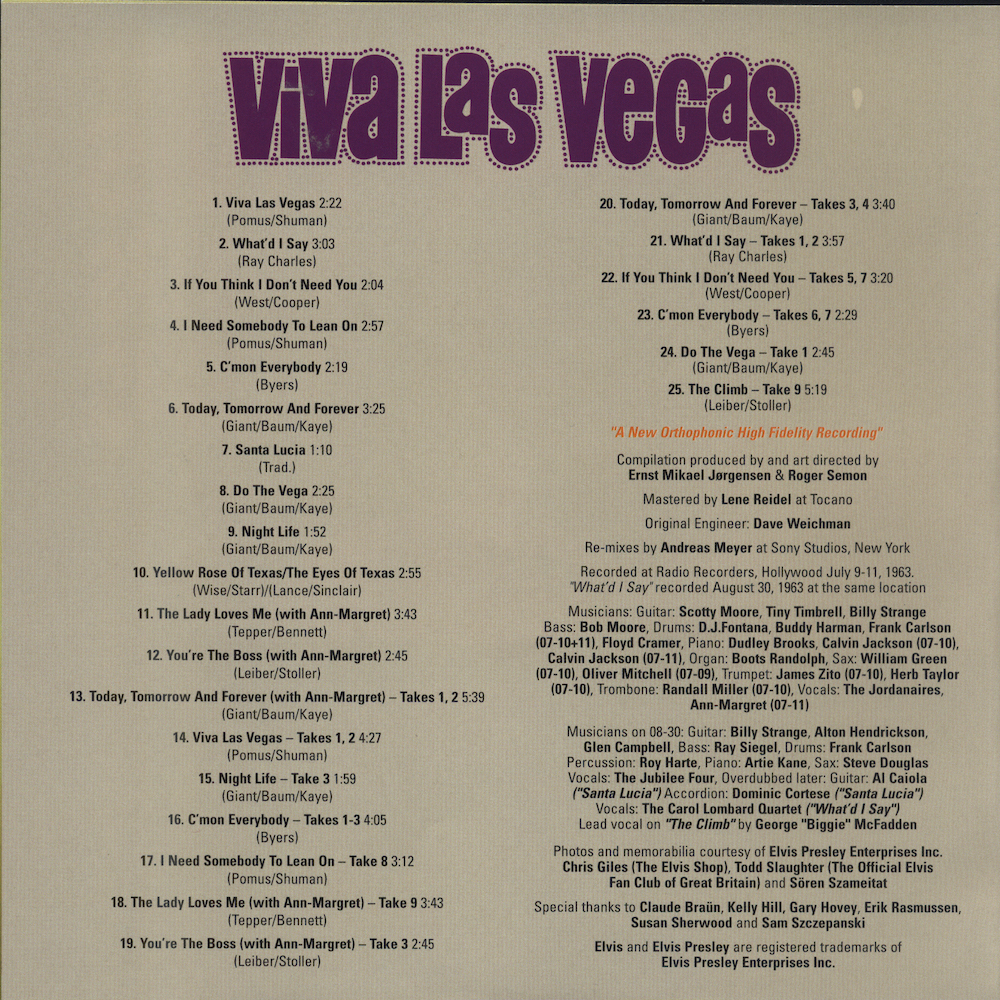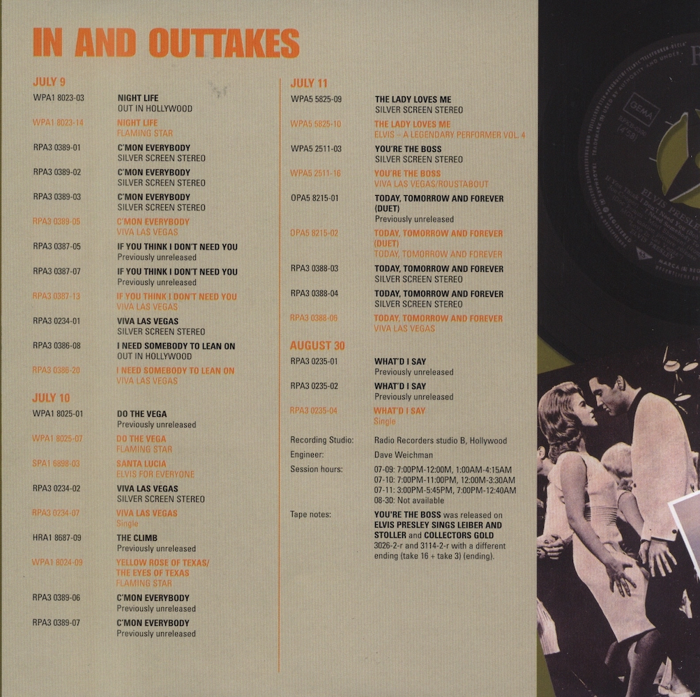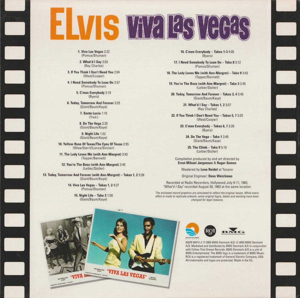 The outtakes released on this CD are presented with "Dry" vocals, as they were originally recorded, with no, or very little reverb (echo). On The Viva Las Vegas Sessions (released in July 2018 - see here) however, the whole set was drenched in reverb, meaning this extended soundtrack CD is still the only place to find some of these outtakes in this form.