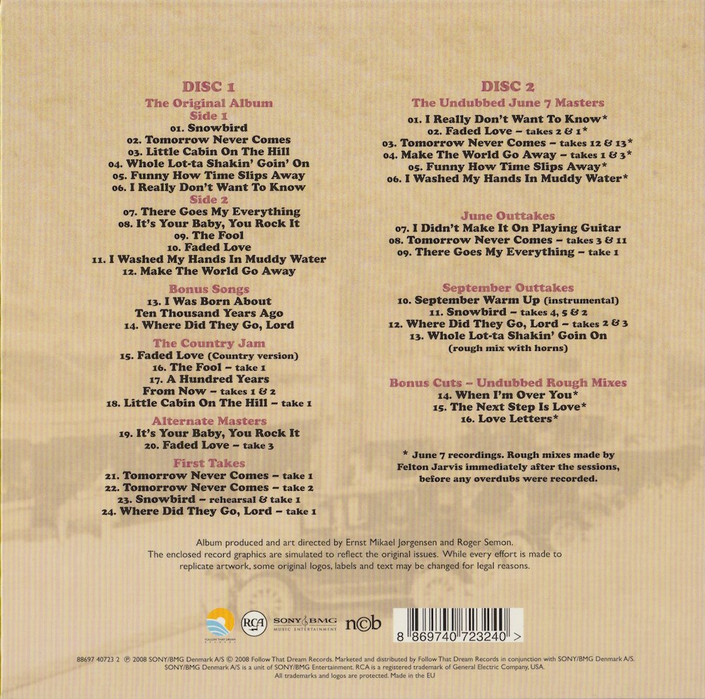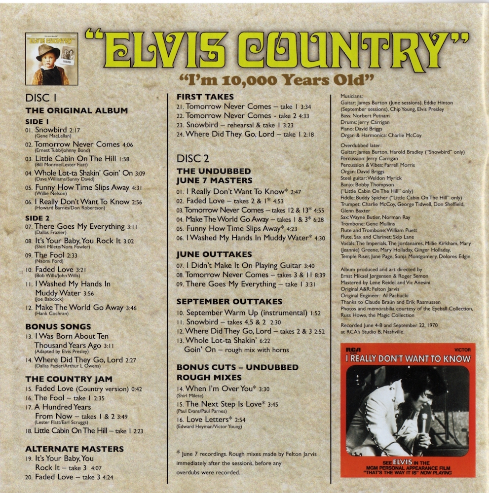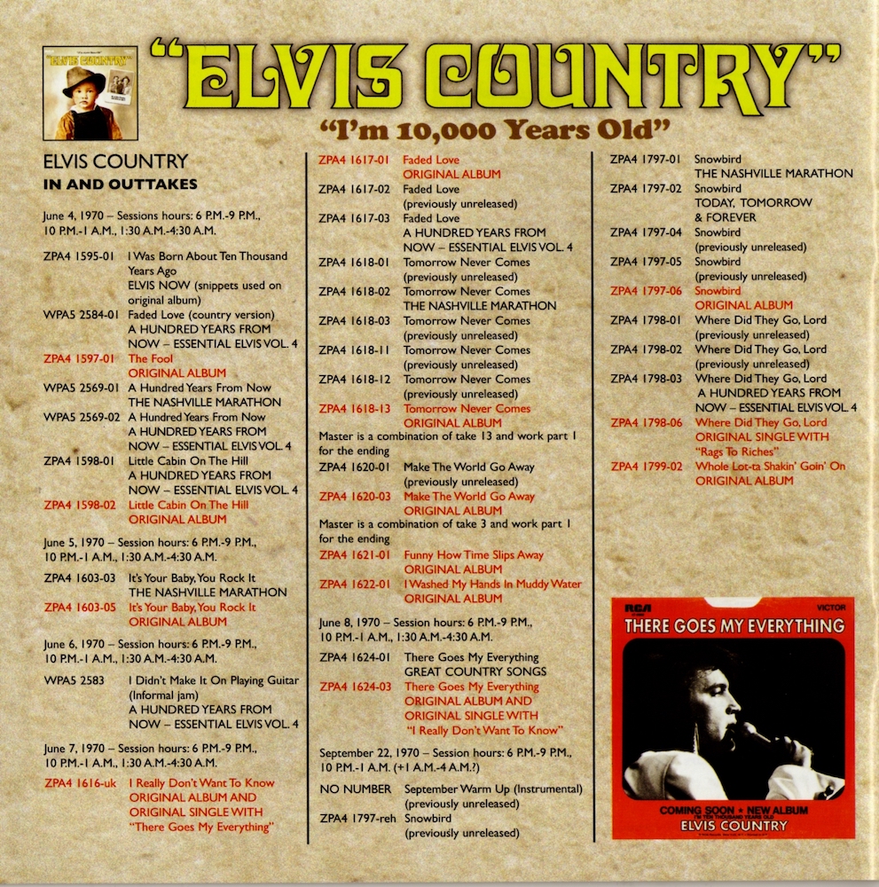What it listed as being 'Make The World Go Away (takes 1 and 3)' (CD2, track 4) is actually a short rehearsal, take 1, the count-in for take 2 (which was cut from the session tape) and the undubbed composite master - the composite master is a composite of take 3 and "work part - ending" take 1.