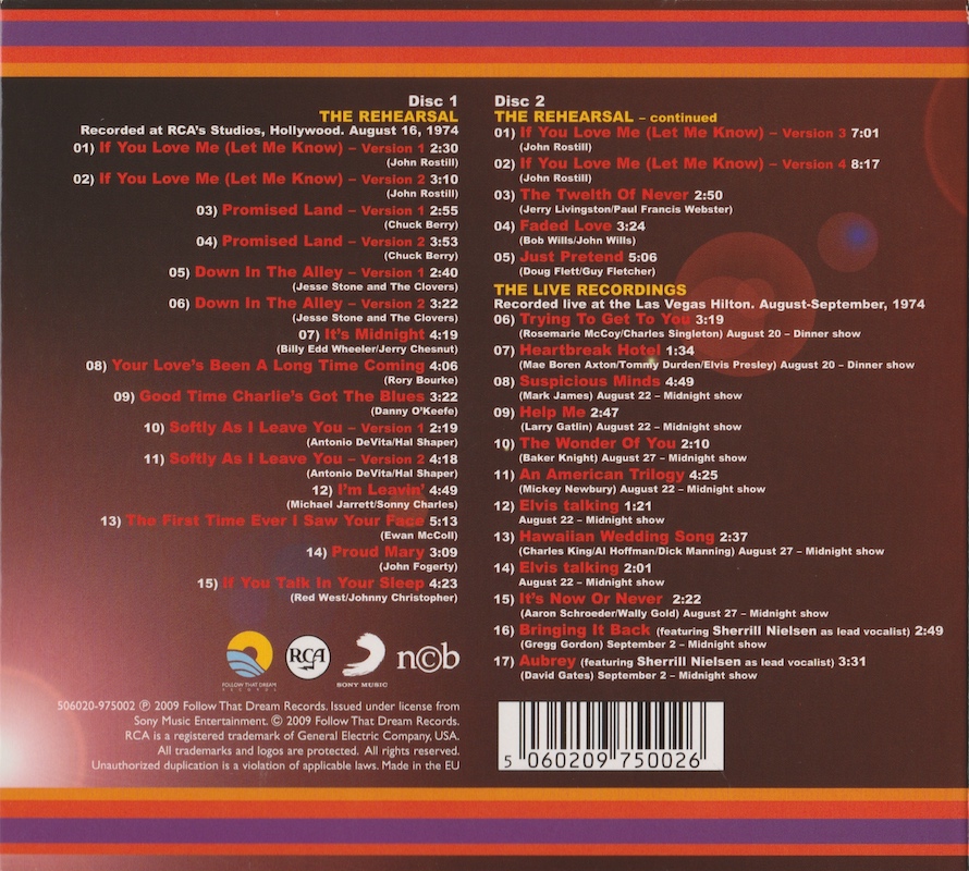 The recordings listed on the cover as being from the August 20 dinner show are actually from the midnight show of August 20. Other tracks incorrectly dated are 'An American Trilogy' (CD2, track 11), 'Elvis talking' (CD2, track 12) and 'Elvis talking' (CD2, track 14) which are all from the midnight show on August 27, but are listed as being from the August 22 midnight show.