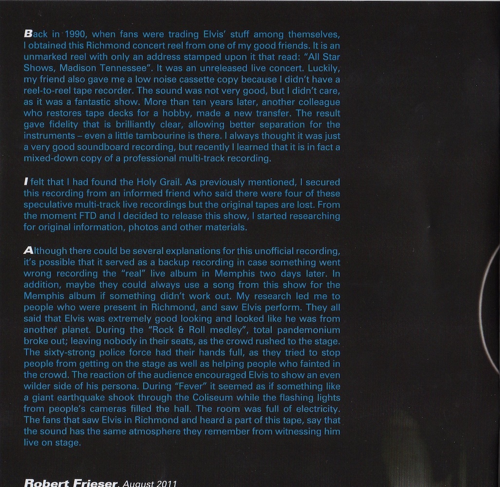 The main concert was recorded on a 16-track tape machine by RCA, but the original 16-track tape is lost, or even possibly erased. This is a 2-track mono copy of the original 16-track tape.
