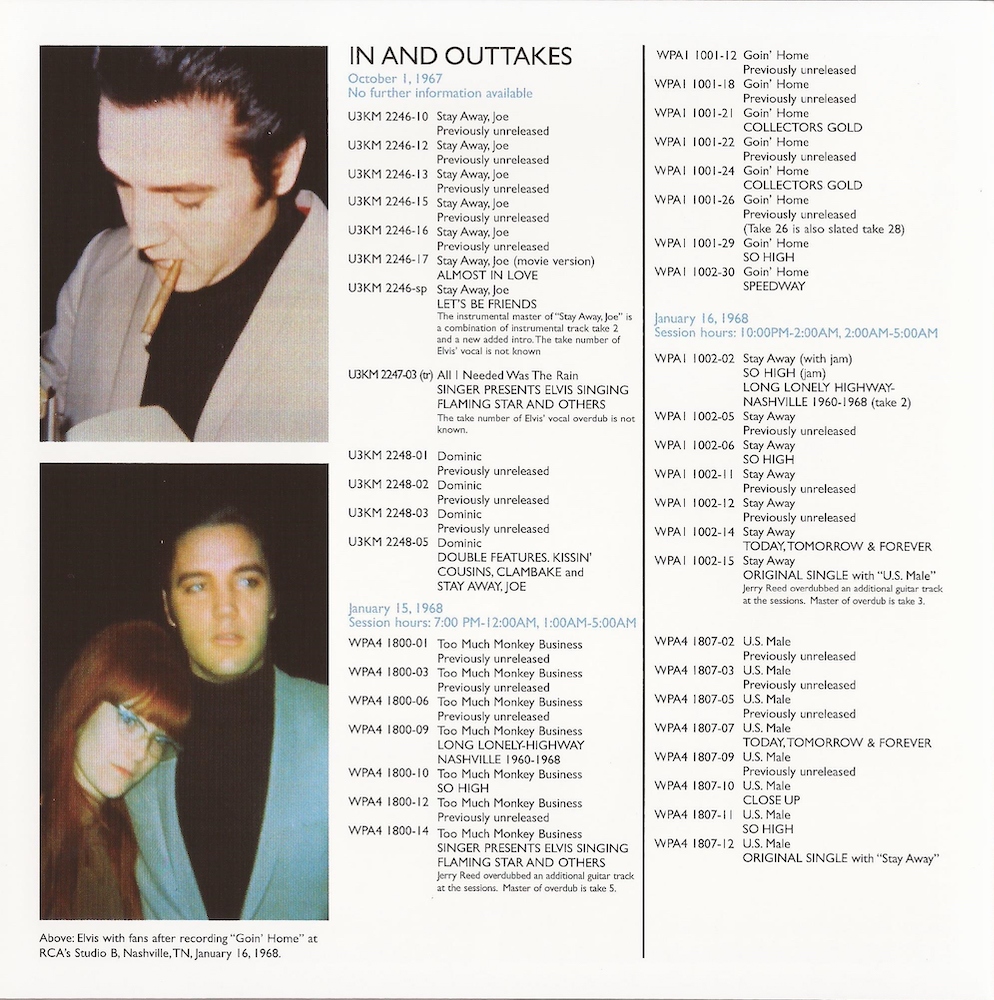 What is listed as 'U.S. Male' takes 2, 3, 5 and 7 (track 10) is actually a very heavily edited jam entitled 'The Prisoner's Song' followed by the first false start and long false start of take 2, some talking from take 4, take 5 itself, the false start of take 6, the complete take 7.