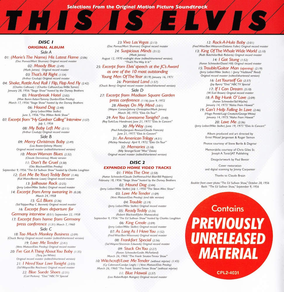 'Trouble / Guitar Man' (CD2, track 15) is listed as being an "edited/shortened version" with a timing of 2 minutes and 19 seconds long, but it's actually the regular opening version from the NBC-TV special, and the timing is actually 3 minutes and 27 seconds long!
