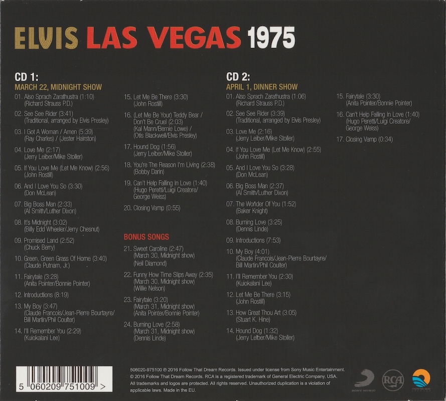 Although not listed on the cover, Elvis sings a line of 'I'll Be There' before 'You're The Reason I'm Living' (CD1, track 18) at the March 22 show and a line of 'The Great Pretender' during the introductions at the April 1 show (CD2, track 9).