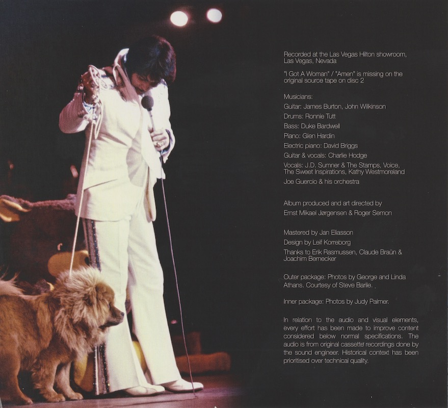 The March 22 concert is presented here exactly as it is on the original cassette tape in RCA's vaults. The audience recording of the same concert however, only matches the tape from 'If You Love Me (Let Me Know)' onwards, and has Elvis singing a few lines of 'Roses Are Red' before 'Love Me'. The first four songs on the soundboard are thought to come from the dinner show on March 20, although Ernst Jørgensen has stated there is no explanation as to why they are on this tape with the rest of the March 22 midnight show, if it is not one complete tape. Another explanation of course could be that the audience recording is spliced with the beginning of another concert!