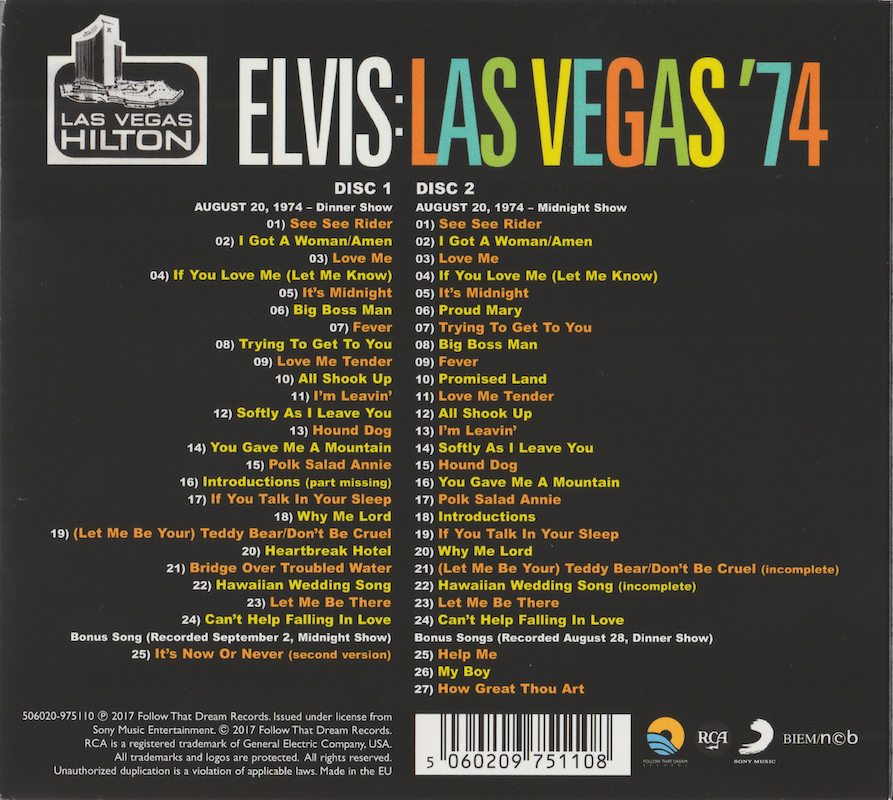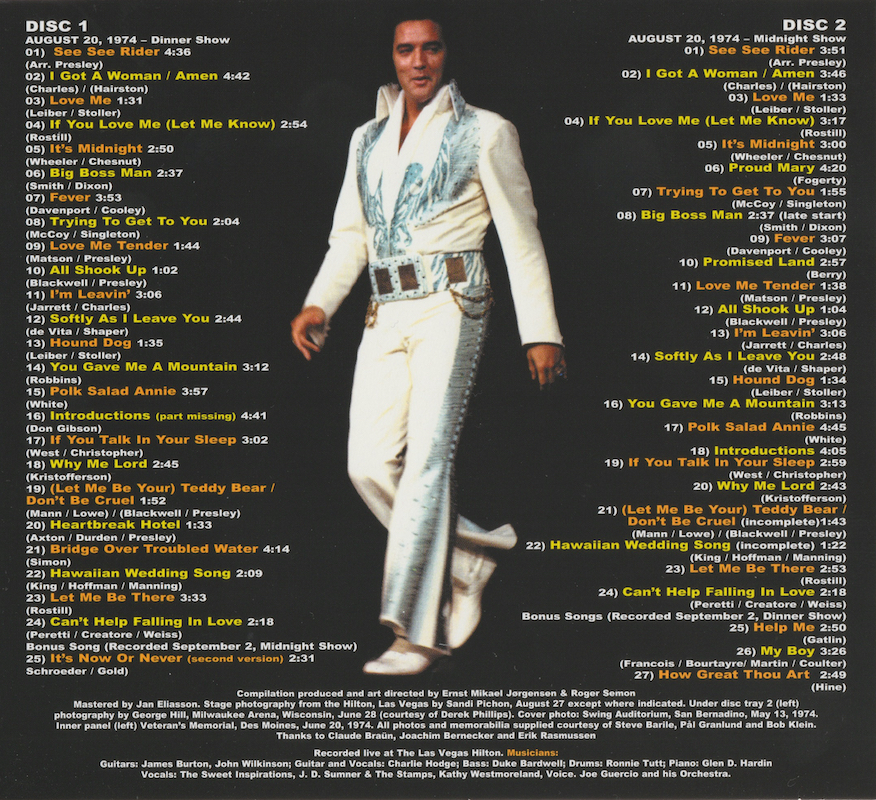 This was one of the best of Elvis' shows I've ever seen. He sang hard and well, was energetic, didn't puzzle the audience by fooling around in a way they couldn't follow, and maintained a happy and good-natured control throughout. It was one of those shows where the whole thing went over beautifully and there was that wonderful warm rapport between Elvis and his audience. At the end of the show, there was an almost complete standing ovation. Not only did the people at the front and round the ramp stand, but everyone all the way to the back and everyone in the balcony. The feeling produced by this kind of show is a unique and quite moving experience. Elvis gave out many scarves and ended the show in a very happy mood, full of self-confidence as he acknowledged the audience fixing and thanking the audience to both sides of the ramp as well as in the body of the room and in the balcony. It's very gratifying to see him make the audience happy in a show like this, and to go away so happy himself. This show worked just perfectly and Elvis was inspired. He ended very chuffed by it all that night.