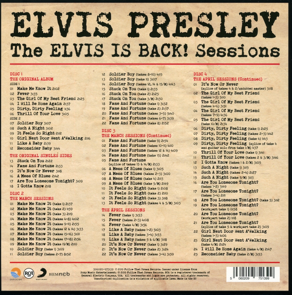 The master of 'Dirty, Dirty Feeling' is primarily take 4, but has the guitar solo from take 1 spliced in, although this was only discovered when FTD went back to the original session tapes when compiling this set, and the tape cut in take 1, along with the splice in take 4 was noticed. When take 1 was released on the classic album of Elvis Is Back in April 2005 (see here) it does not contain the guitar solo, as it was physically cut from the tape they had at that time.