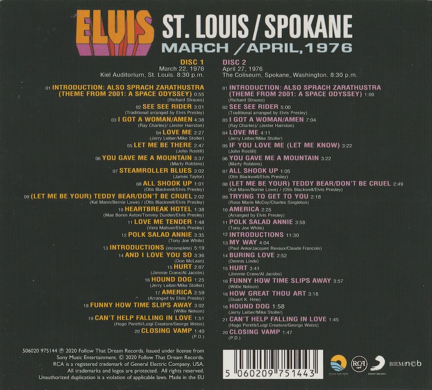 For CD2 the track listing is all wrong on the back cover - 'Burning Love' (track 14) is listed as 'Buring Love', 'How Great Thou Art' (track 17) and 'Hound Dog' (track 18) are both listed as being track 16, and 'Can't Help Falling In Love' is listed as track 21 instead of track 19!