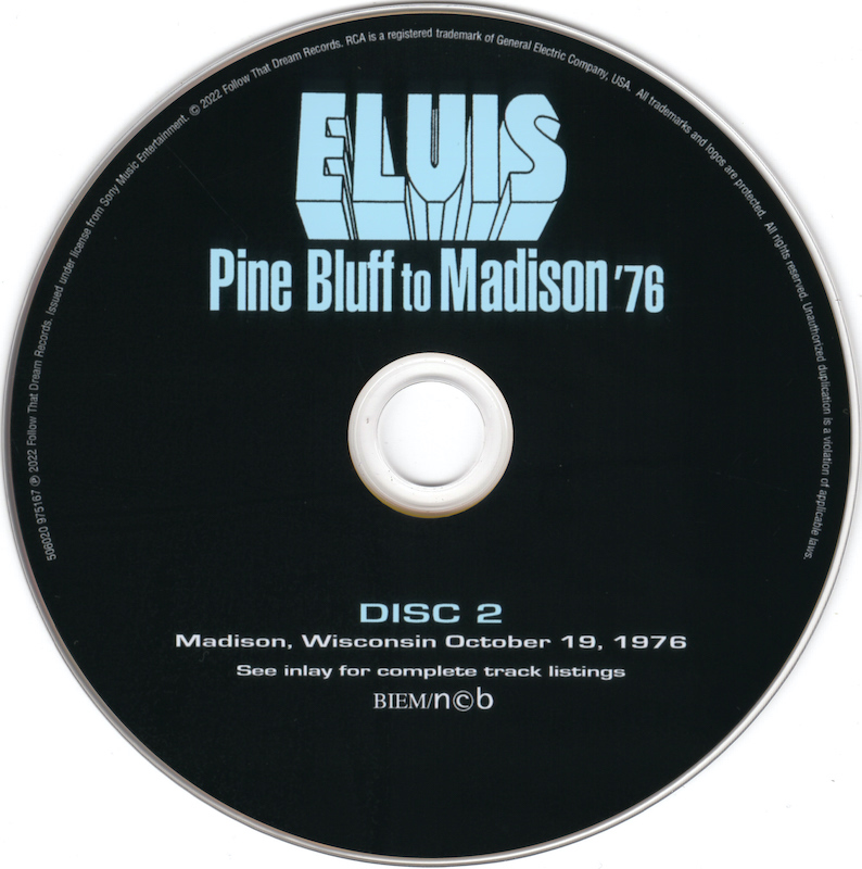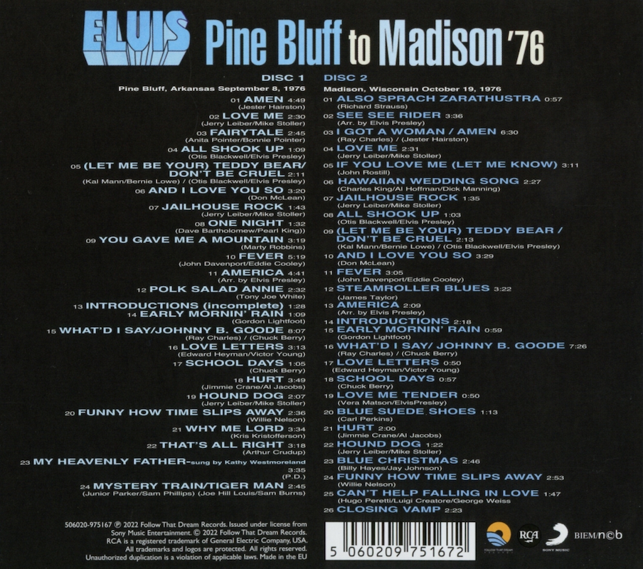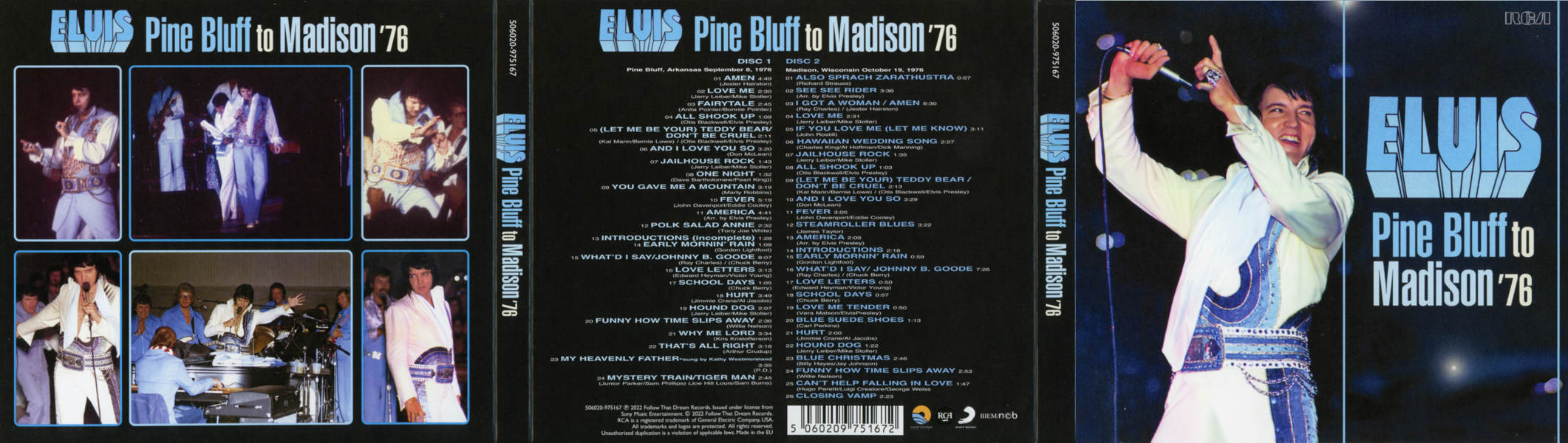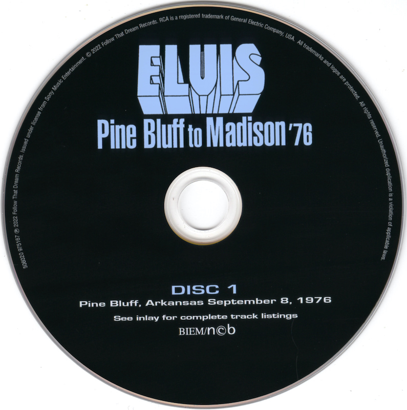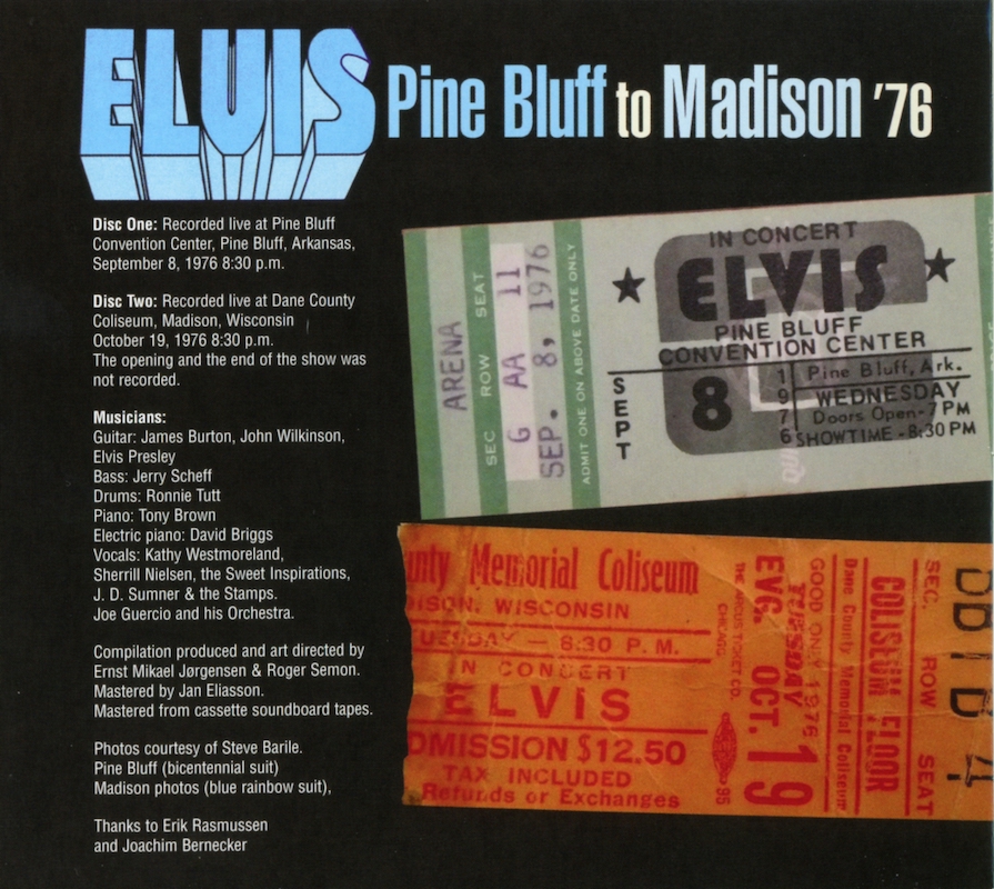 Unfortunately, the original source tape for the Pine Bluff show (CD1) ran out after 'Mystery Train / Tiger Man', meaning 'Danny Boy', 'Walk With Me' (by Sherrill Nielsen), 'Blue Suede Shoes', 'How Great Thou Art' and 'Can't Help Falling In Love' were not captured on tape.