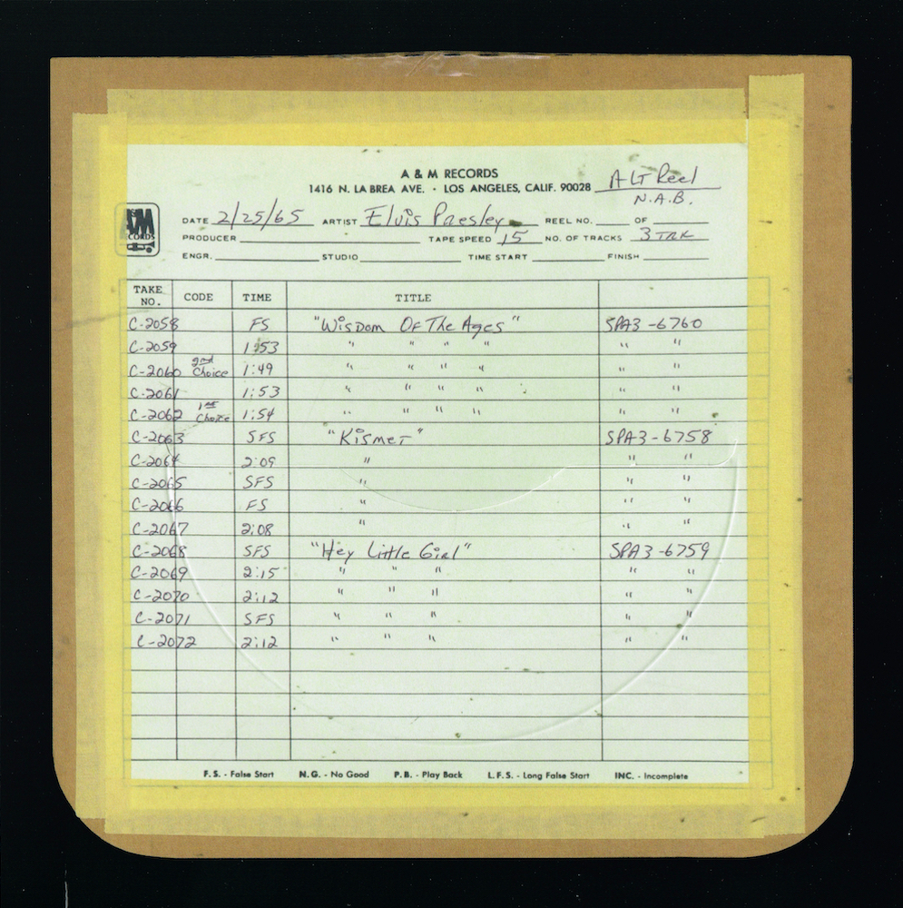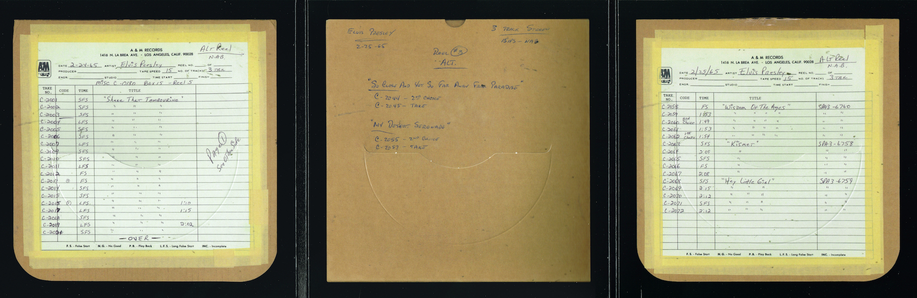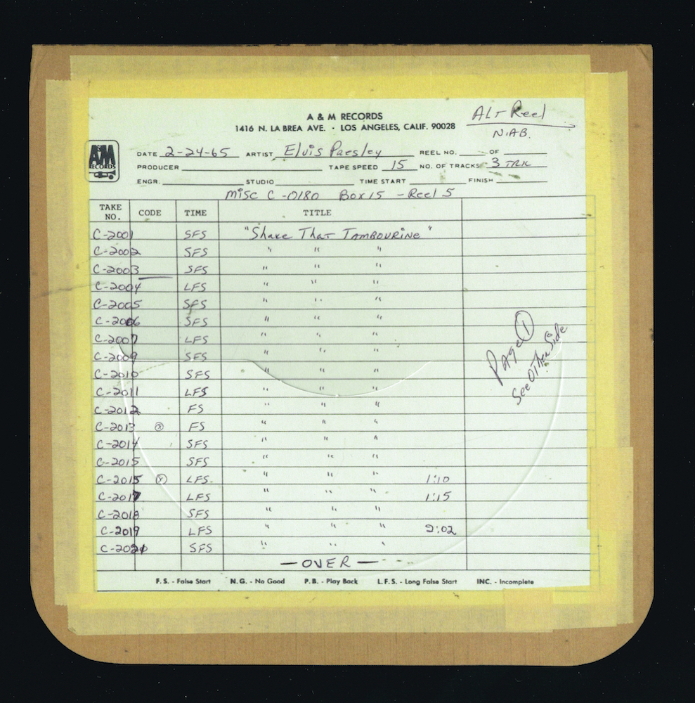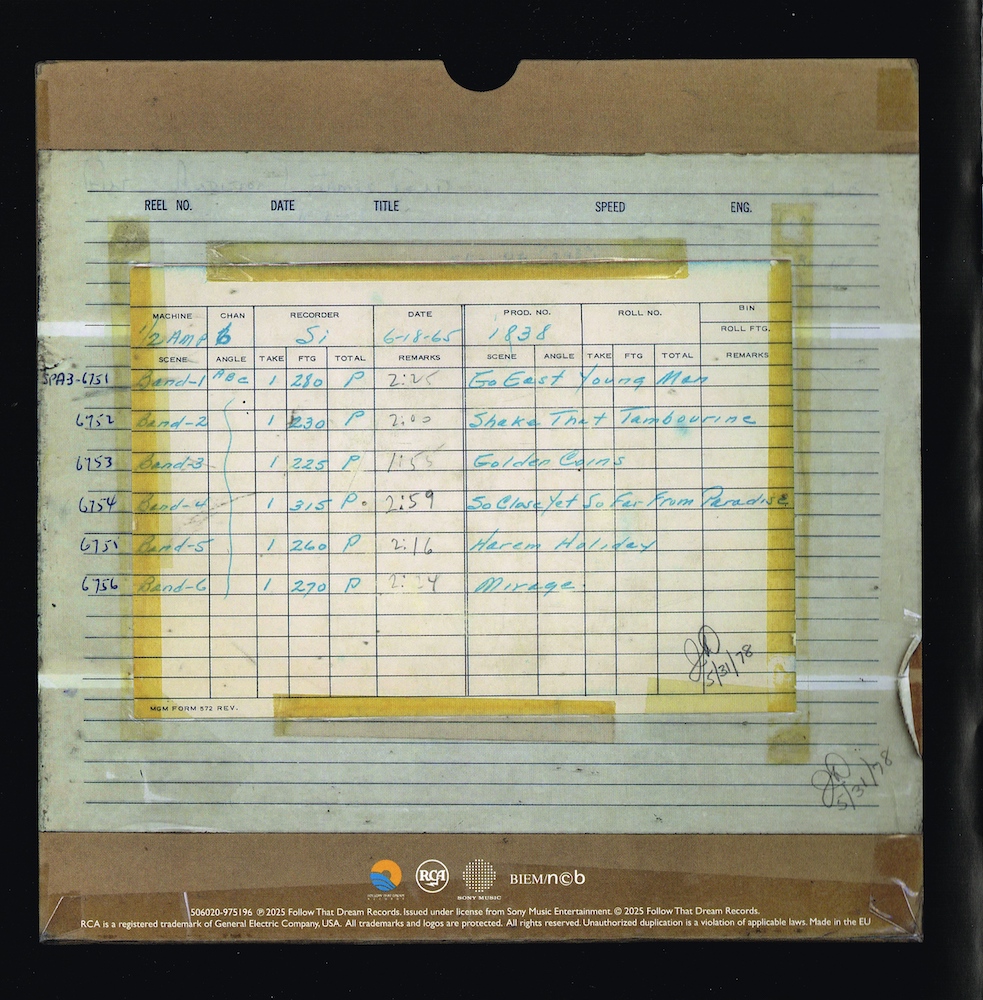 Page 3 of the booklet with this set incorrectly lists 38 takes of 'Shake That Tambourine' (C-2004 to C-2041), even though the session for this song starts at "C-2001" making 41 takes in total. On page 12 it incorrectly shows that the master was spliced from takes 24 and 38 (C-2027 & C-2041) but it should be takes 27 and 41.