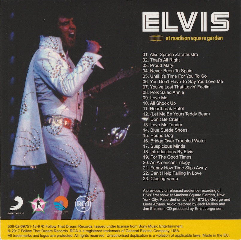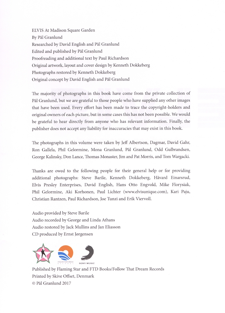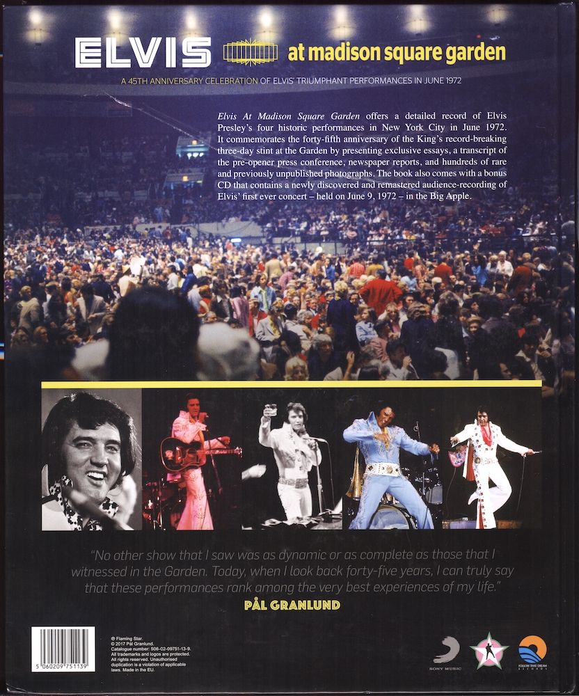 It commemorates the forty-fifth anniversary of the King's recording-breaking three-day stint at the Garden by presenting exclusive essays, a transcript of the pre-opener press conference, newspaper reports, and hundreds of rare and previously unbublished photographs. The book also comes with a bonus CD that contains a newly discovered and remastered audiience-recording of Elvis' first ever concert - held on June 9, 1972, in the Big Apple