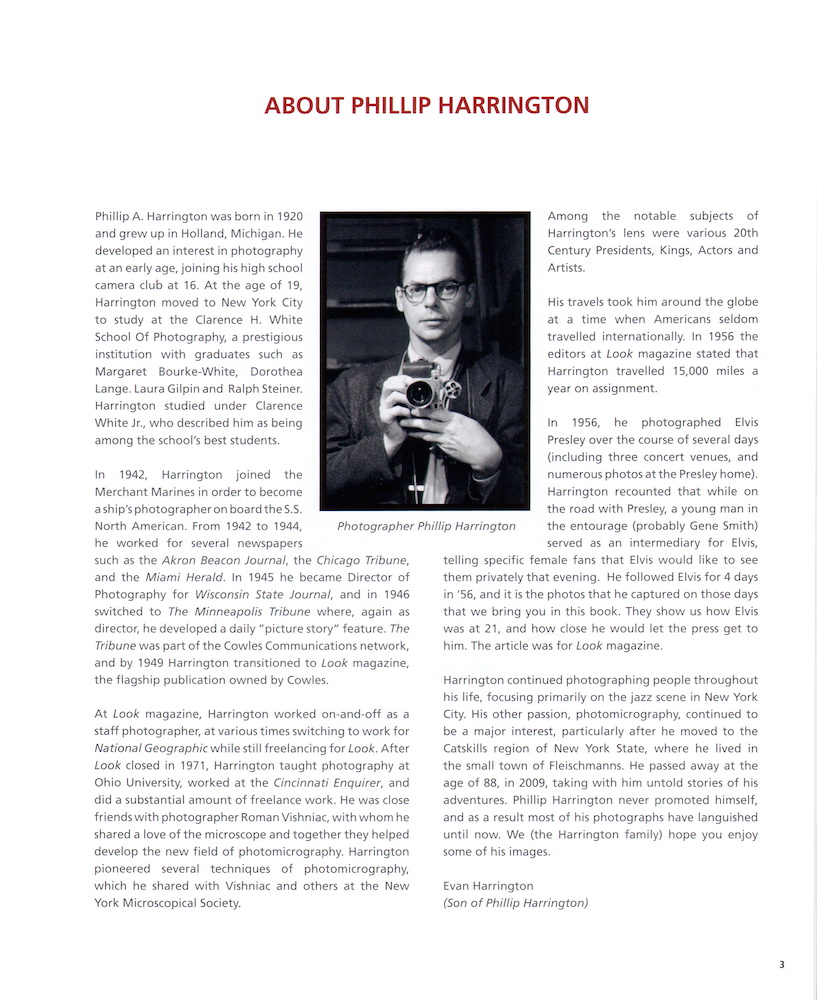 In 1956, Harrington briefly toured with Elvis Presley for a story that he and Gerry Zimmerman published in Look Magazine.