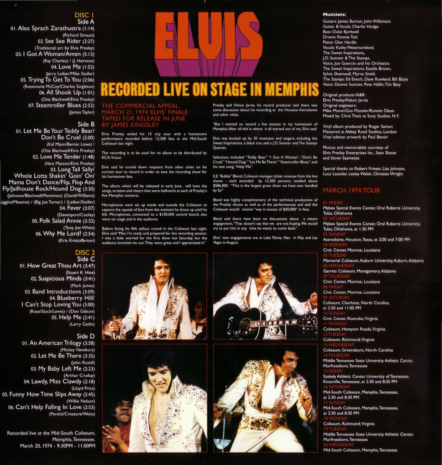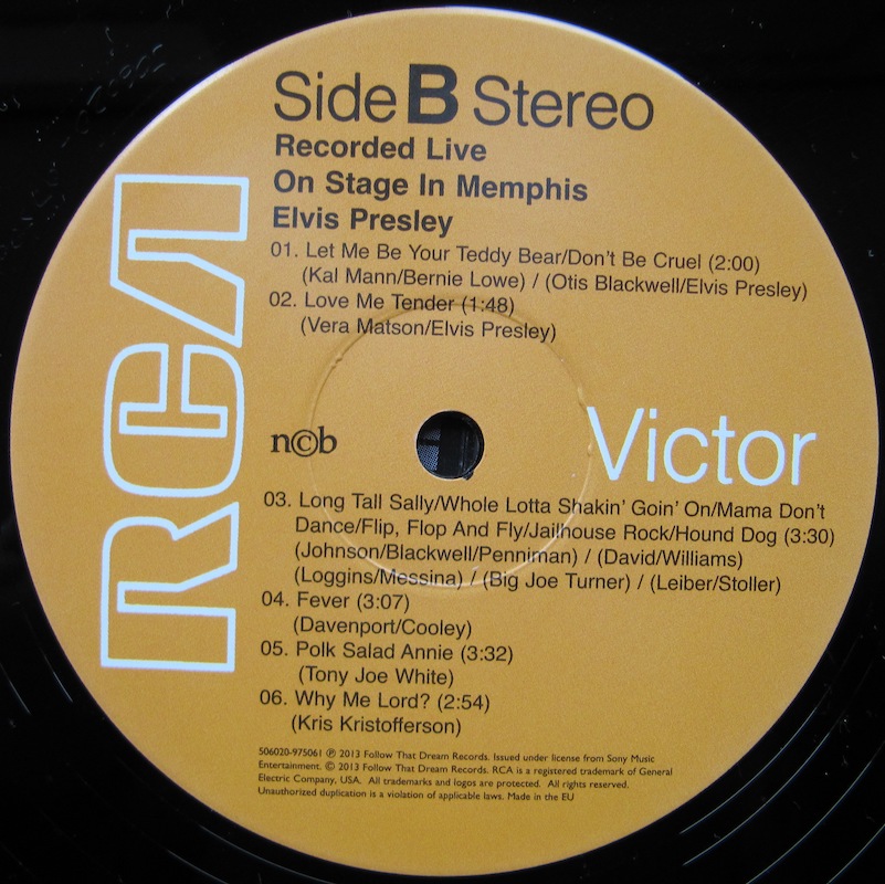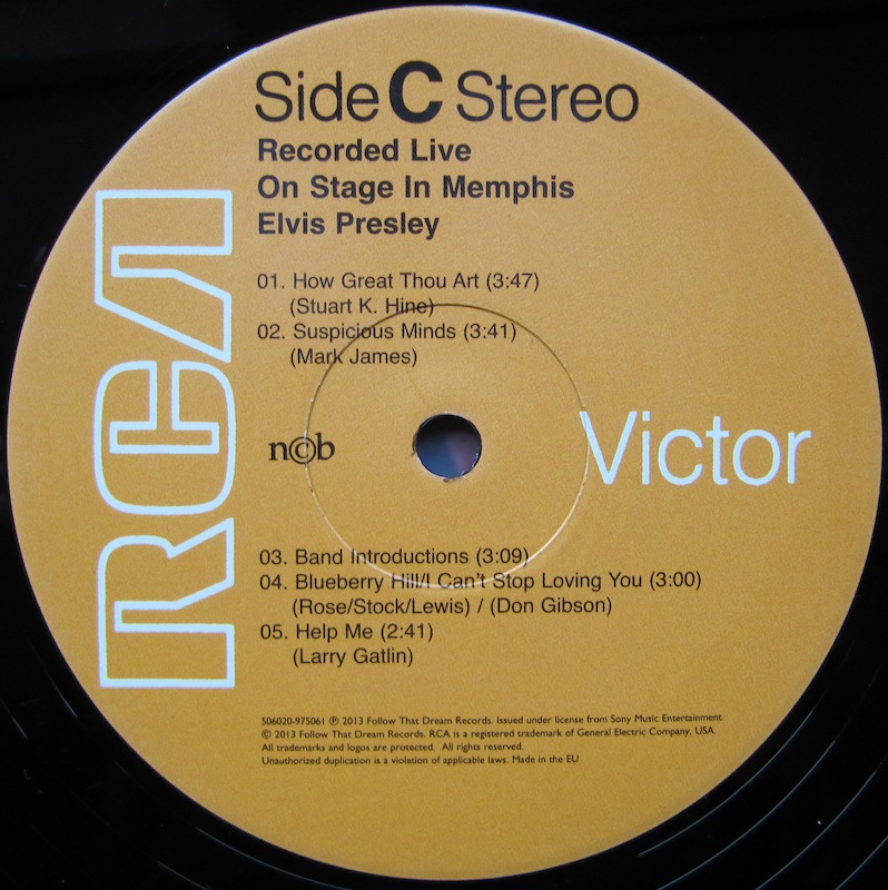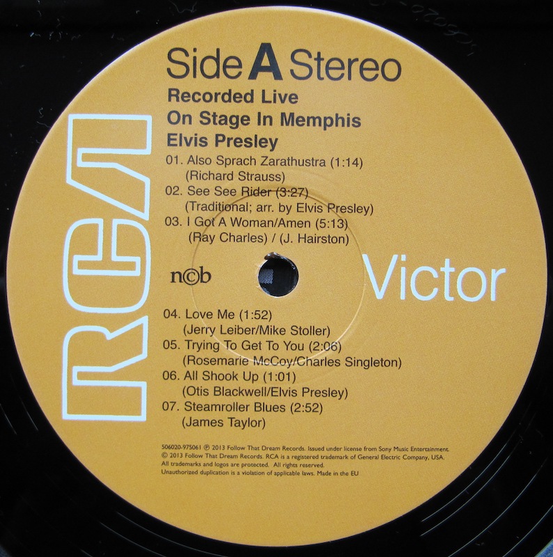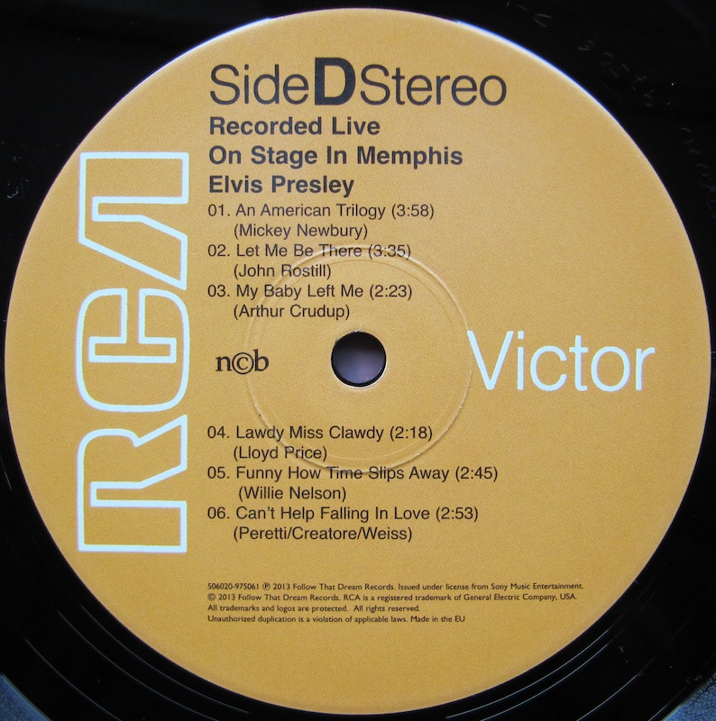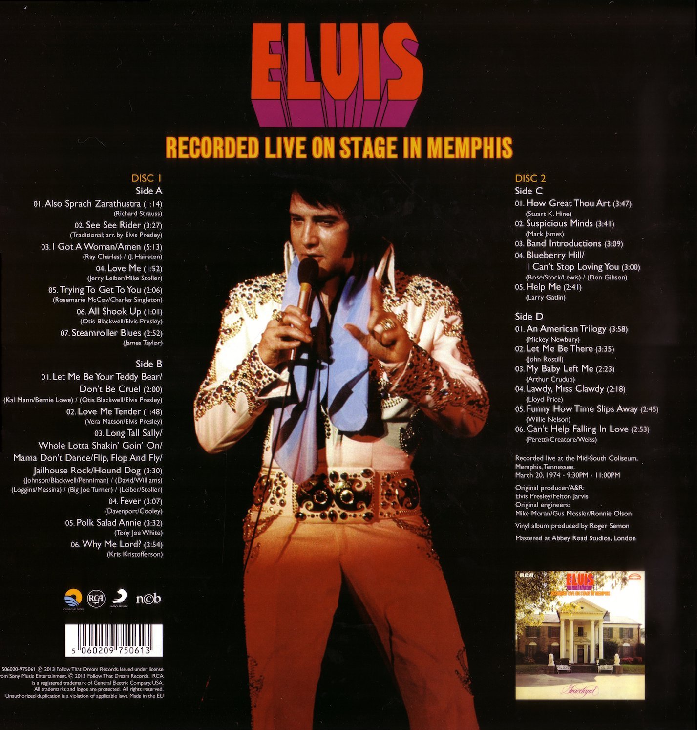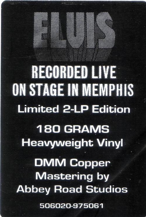 Elvis Recorded Live On Stage In Memphis was first released by Follow That Dream as a classic album CD in April 2004 (see here), and this vinyl edition uses all tracks from that CD.