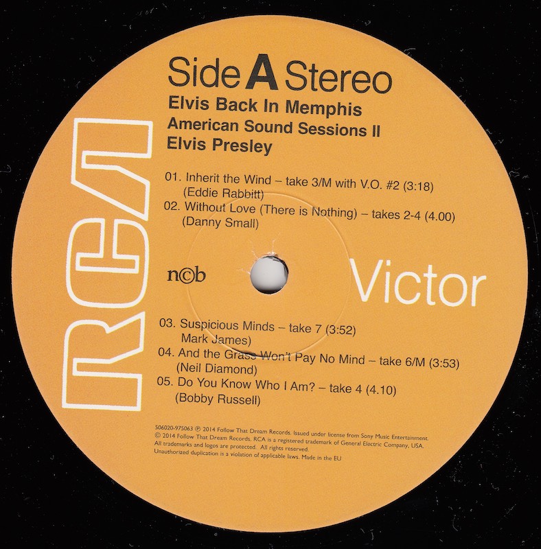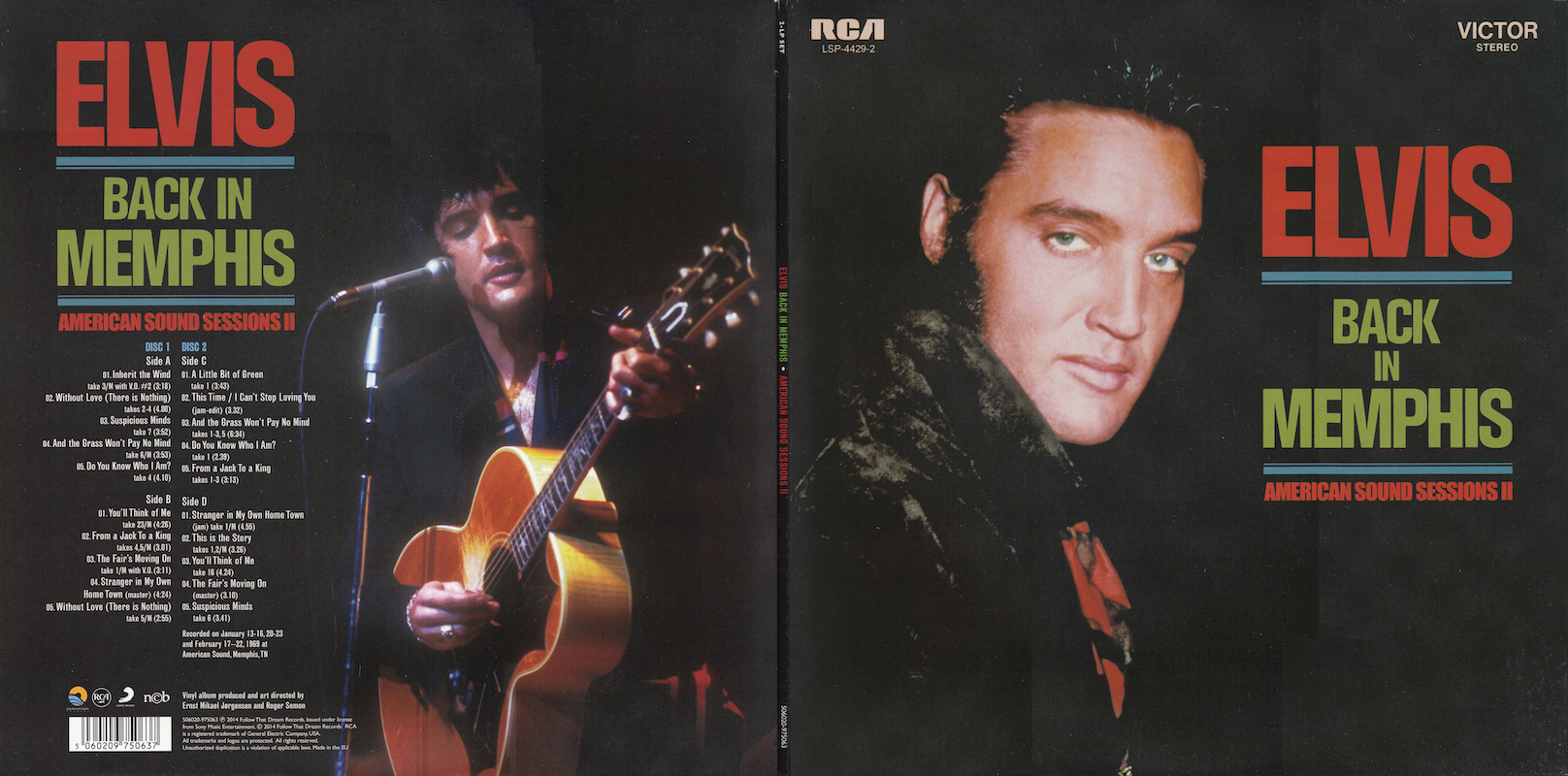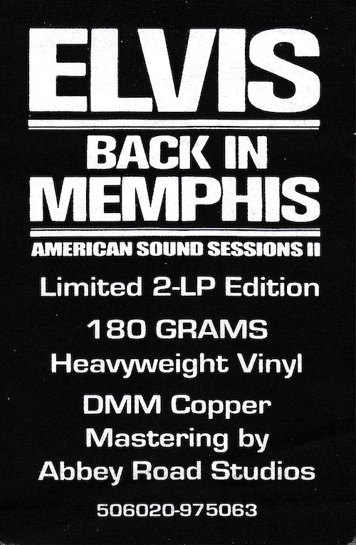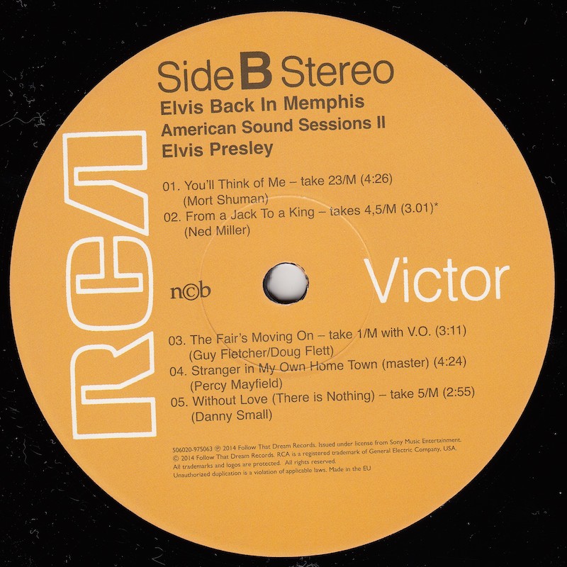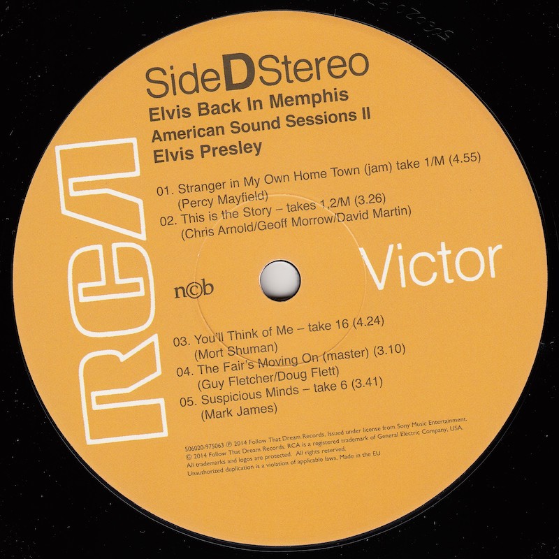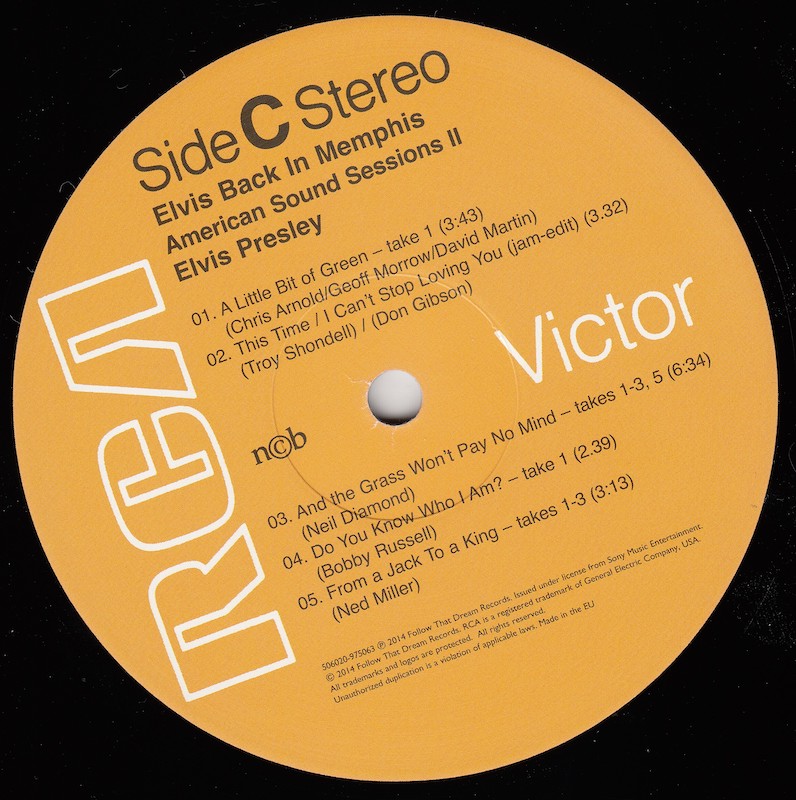 Back In Memphis was first released by Follow That Dream as a 7 inch classic album in December 2012 (see here), and this vinyl edition is a compilation of tracks taken from that original release, although the jam of 'It's My Way (Of Loving You) / This Time / I Can't Stop Loving You' (side C, track 2) is taken from the FTD set From Elvis At American Sound Studio (see here).