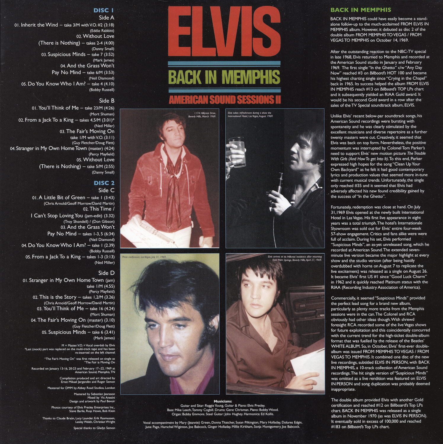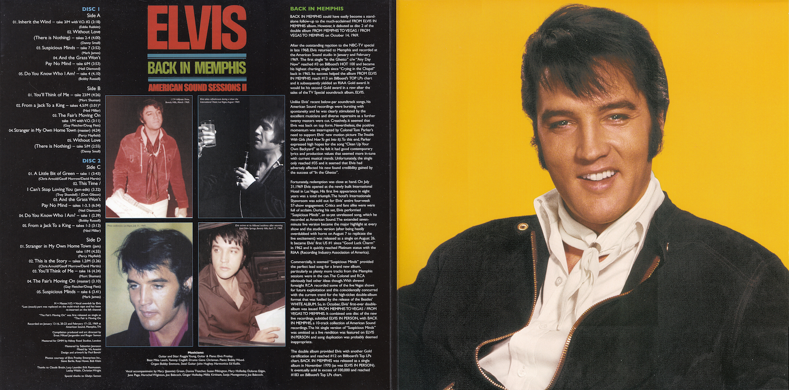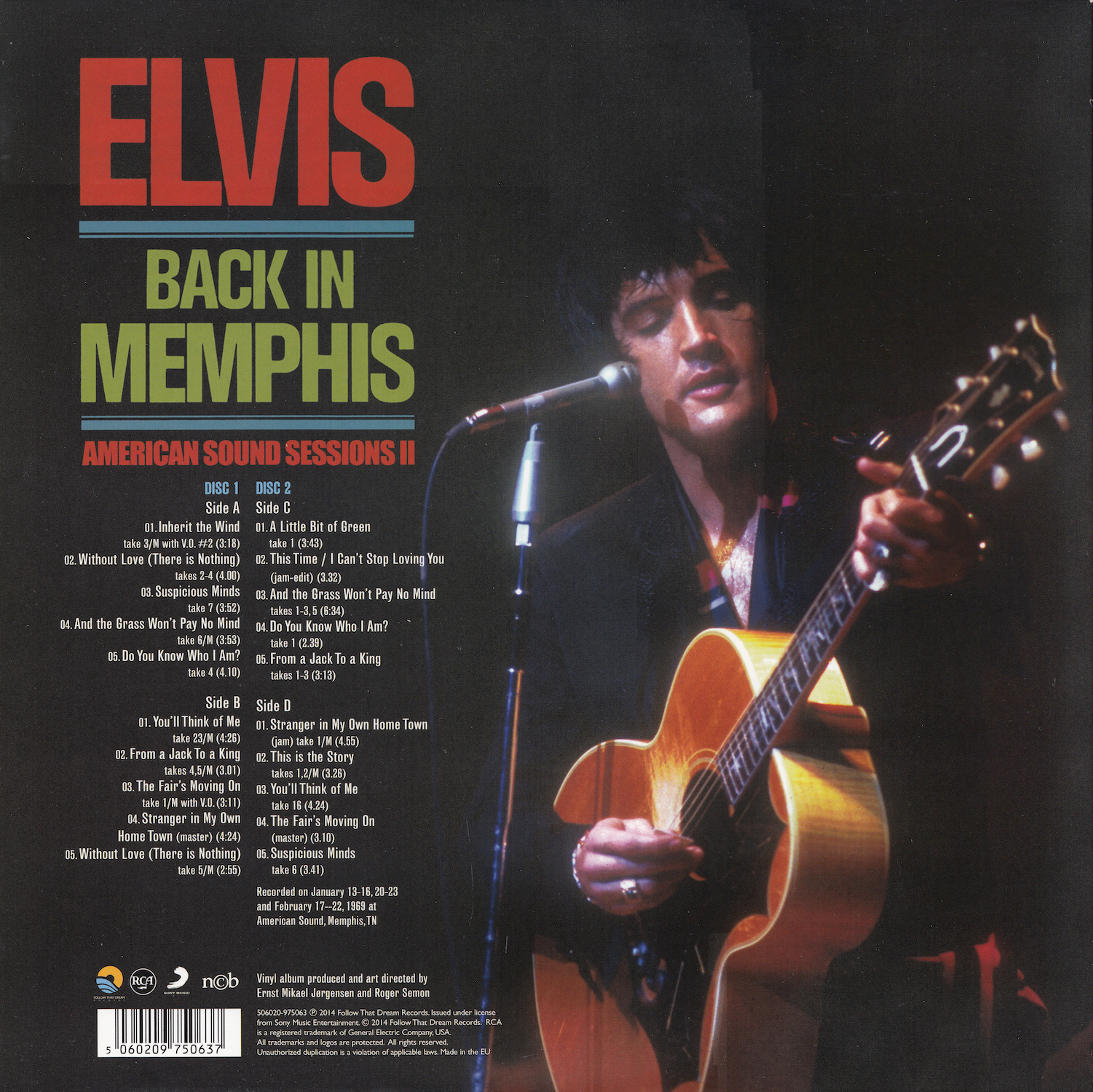 Back In Memphis was first released by Follow That Dream as a 7 inch classic album in December 2012 (see here), and this vinyl edition is a compilation of tracks taken from that original release, although the jam of 'It's My Way (Of Loving You) / This Time / I Can't Stop Loving You' (side C, track 2) is taken from the FTD set From Elvis At American Sound Studio (see here).