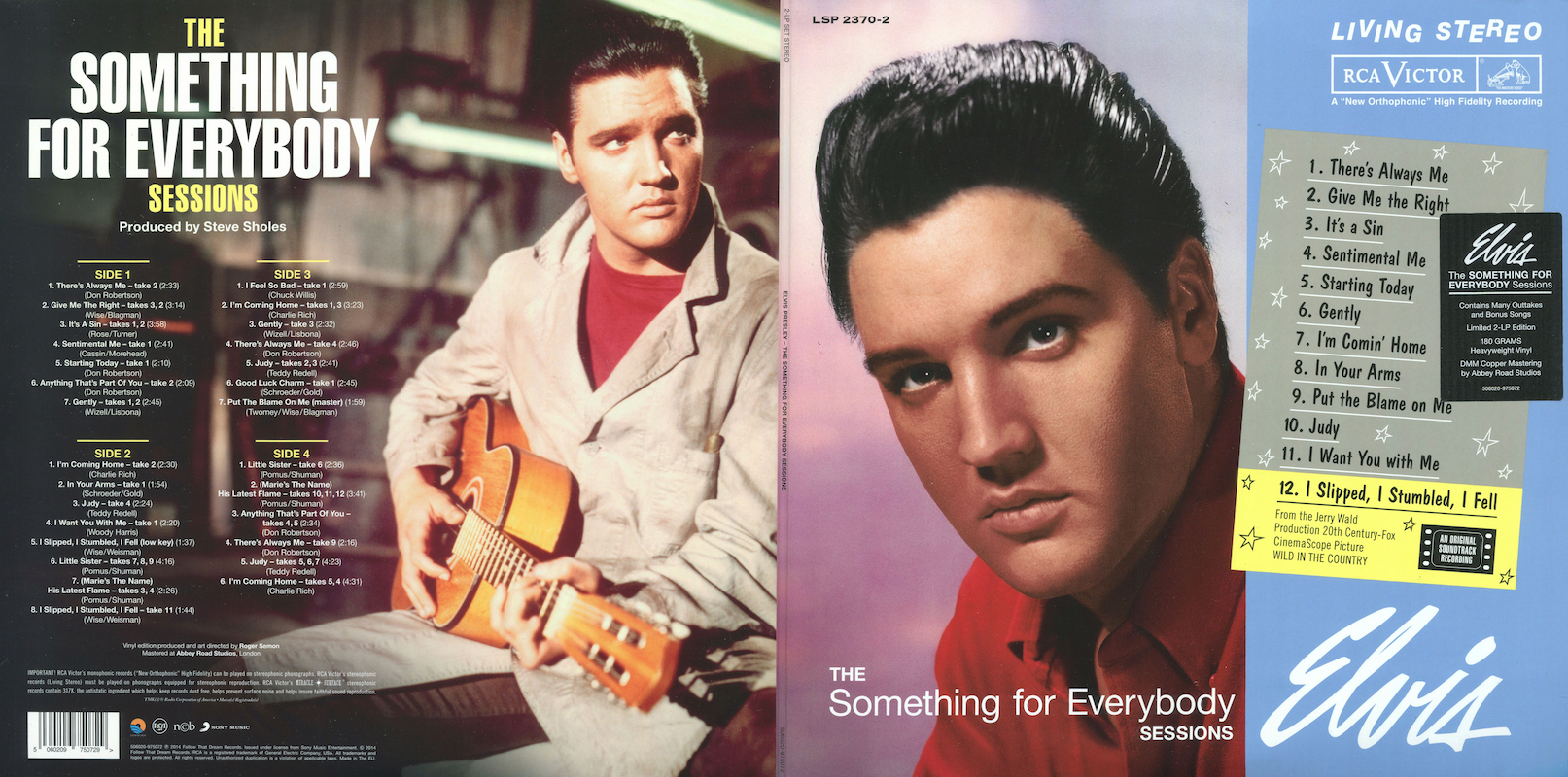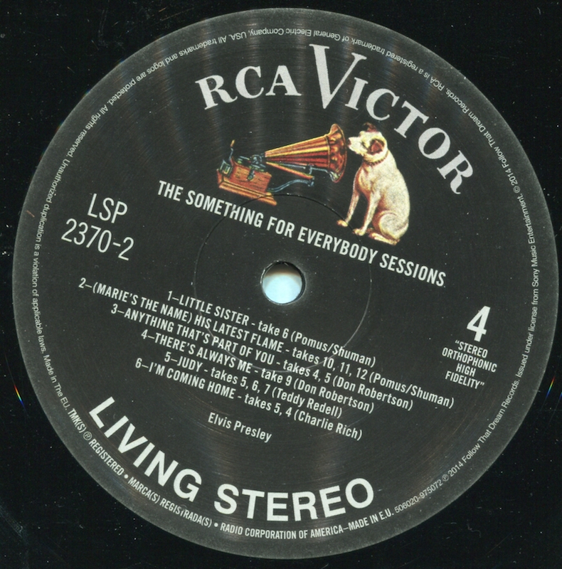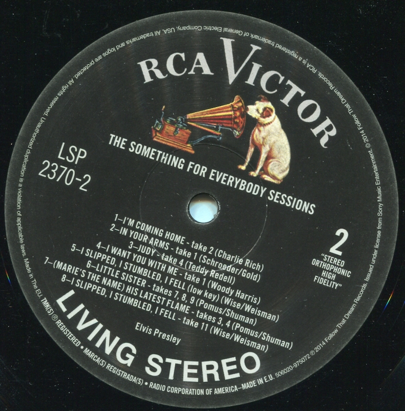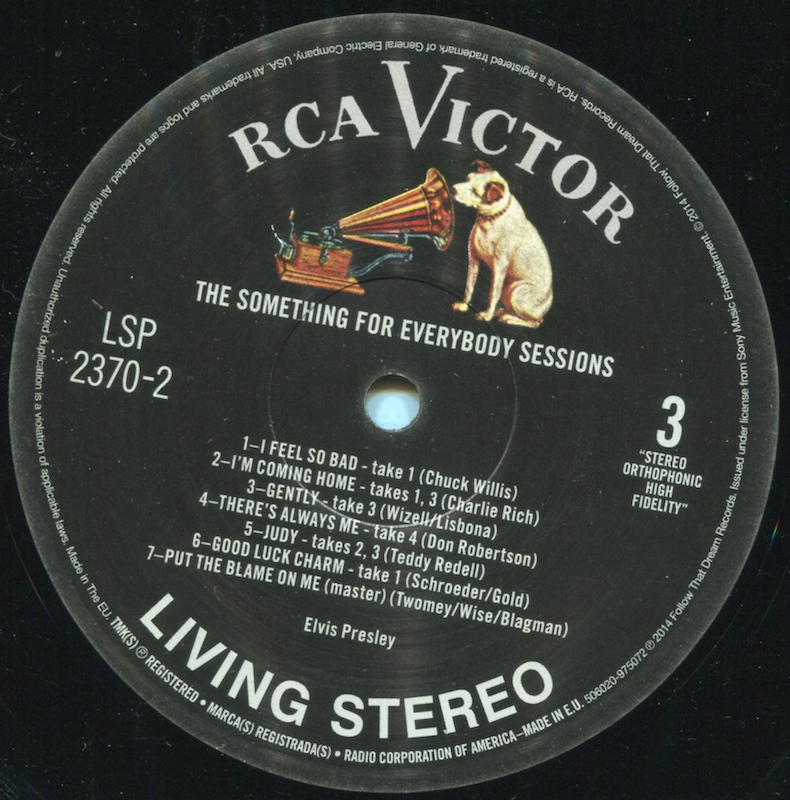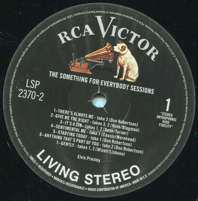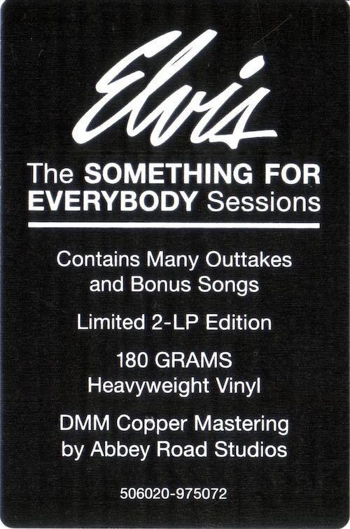 Something For Everybody was first released by Follow That Dream as a 7 inch 'Classic Album' format CD set in April 2006 (see here), and it was this set that the masters and outtakes on this vinyl edition are taken from, apart from 'I Slipped, I Stumbled, I Fell' (side 2, tracks 5 and 8), which are from the |FTD extended soundtrack of Wild In The Country (see here).