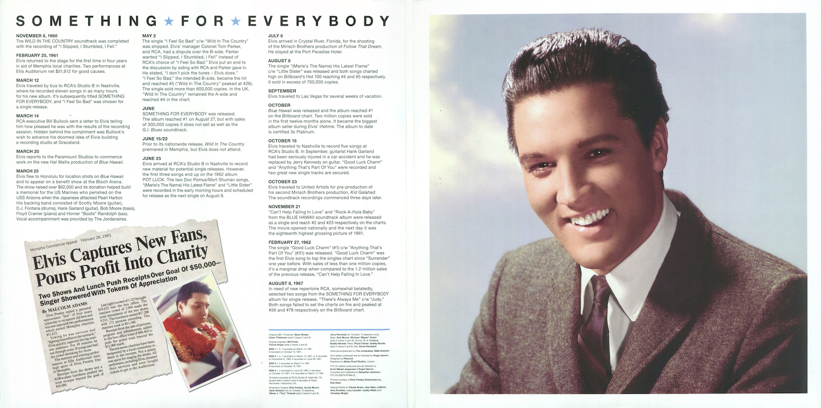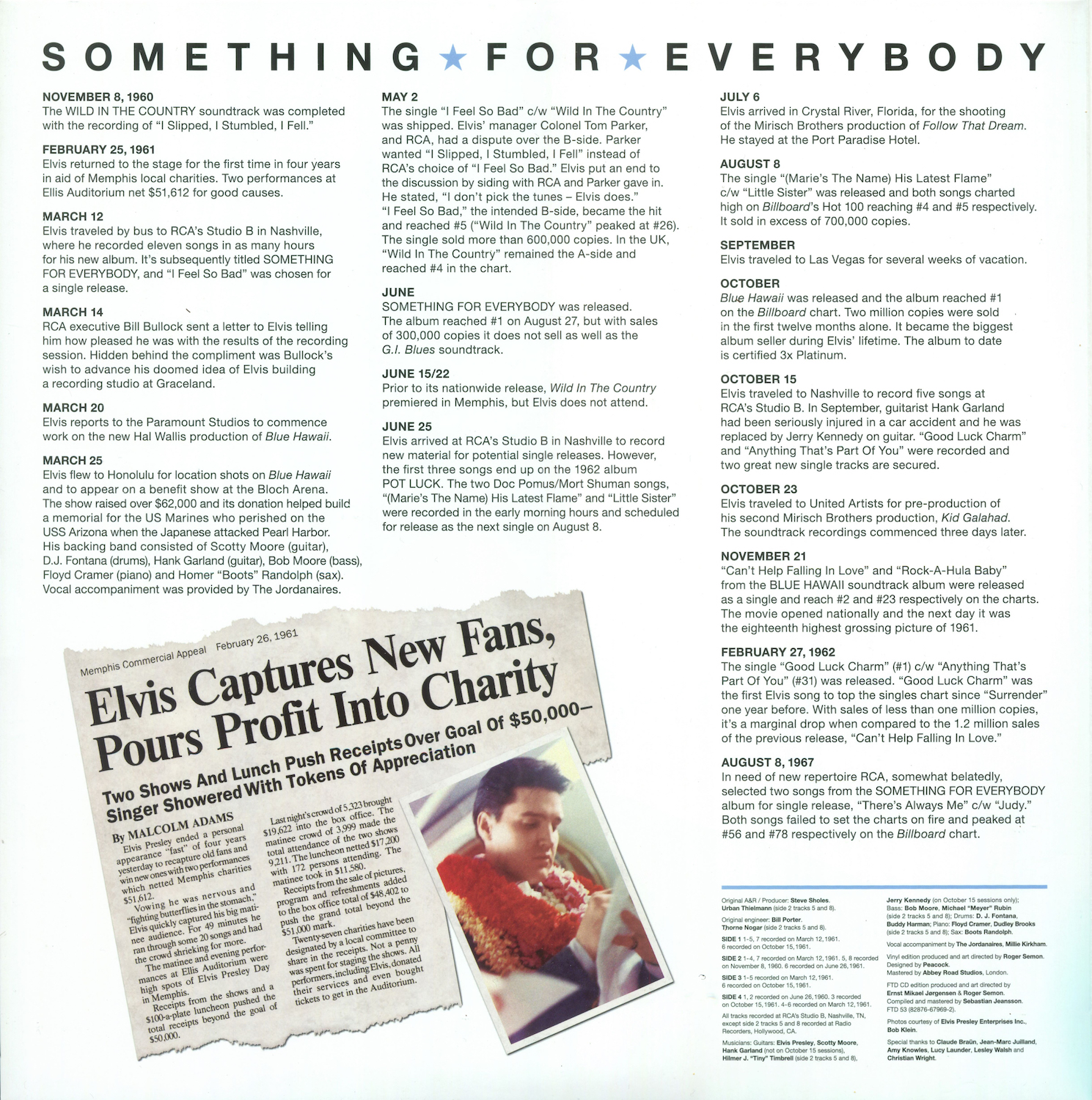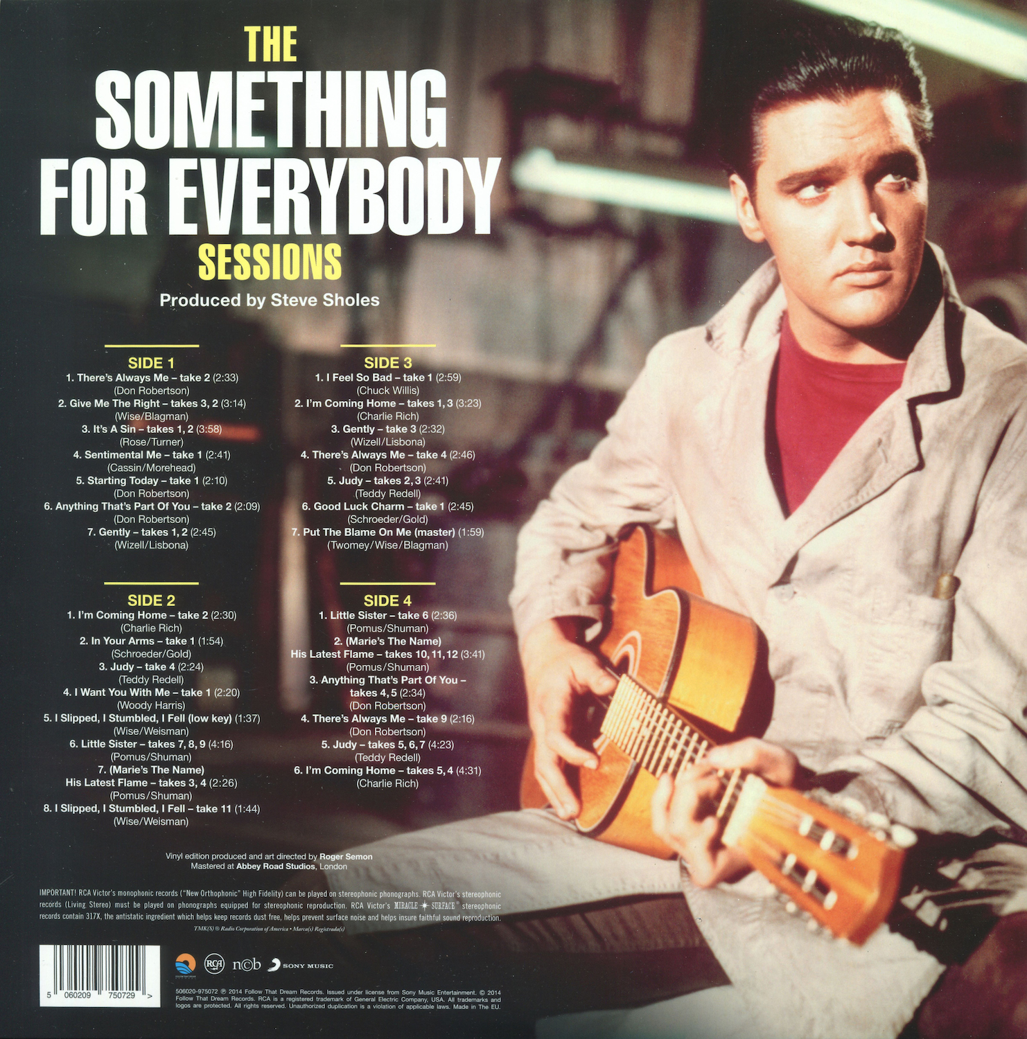 Something For Everybody was first released by Follow That Dream as a 7 inch 'Classic Album' format CD set in April 2006 (see here), and it was this set that the masters and outtakes on this vinyl edition are taken from, apart from 'I Slipped, I Stumbled, I Fell' (side 2, tracks 5 and 8), which are from the |FTD extended soundtrack of Wild In The Country (see here).