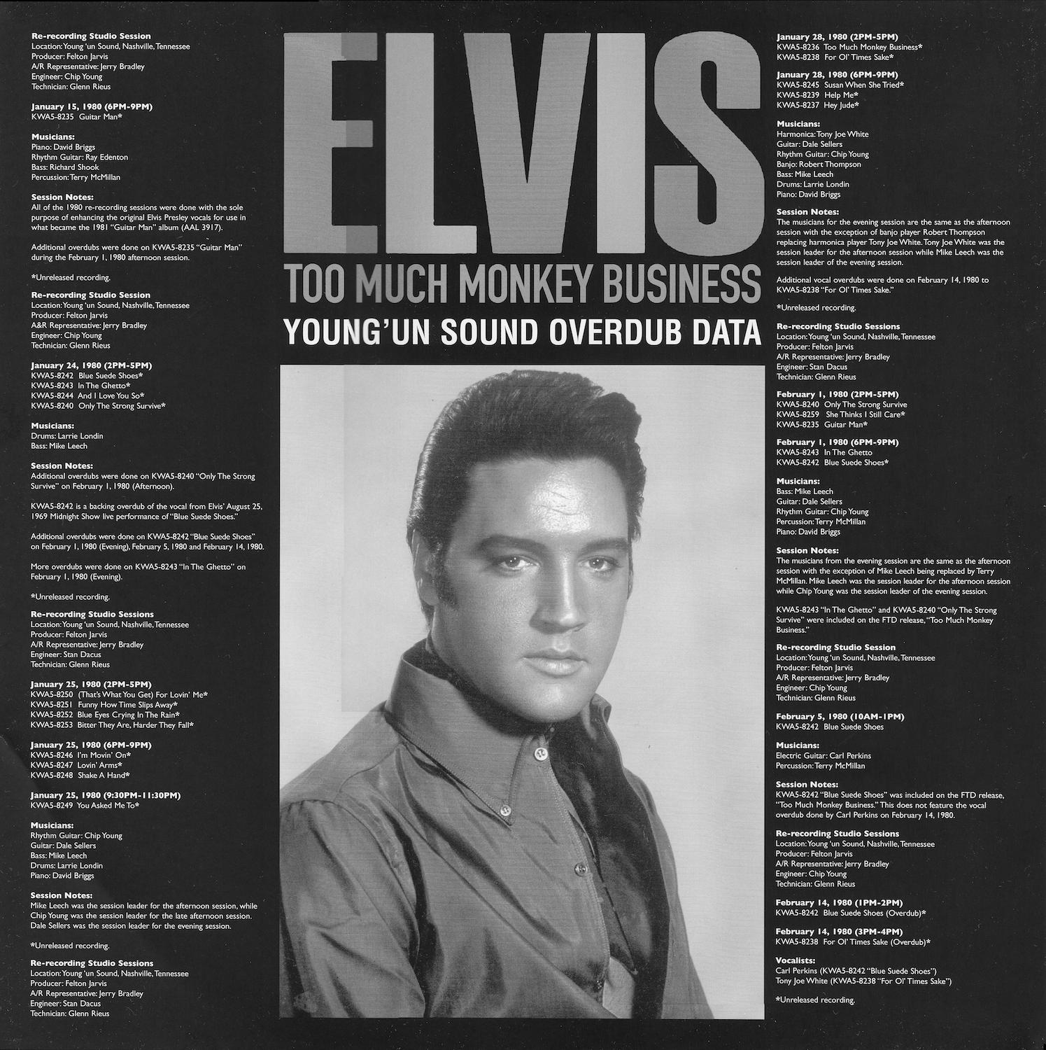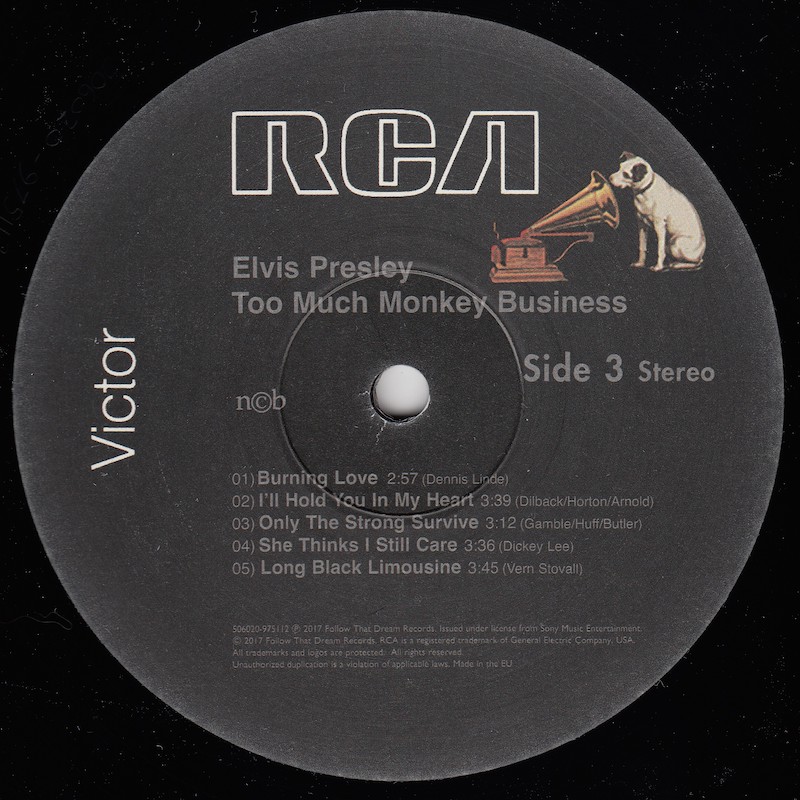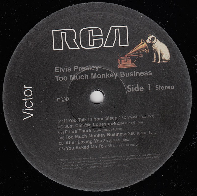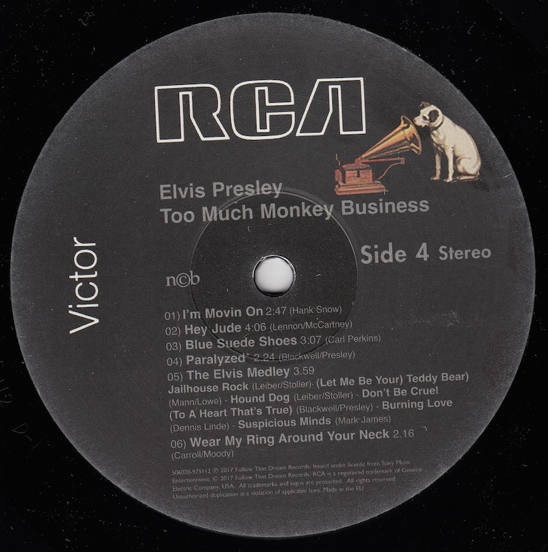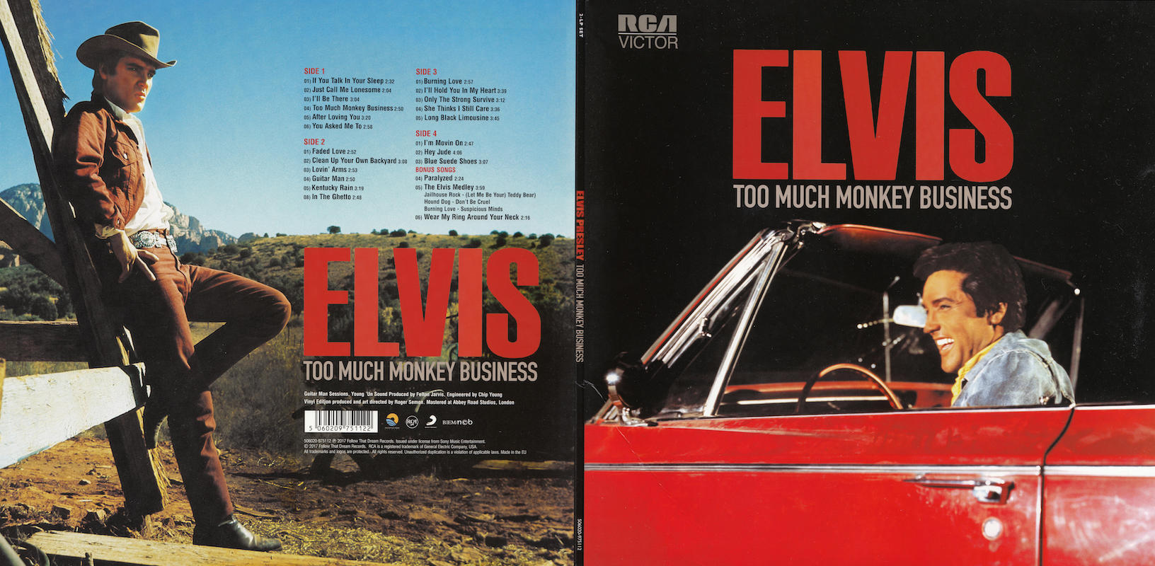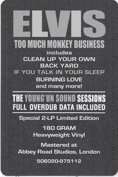 Too Much Monkey Business was first released by Follow That Dream as a 5 inch digipack CD in December 2000 (see here), and this vinyl edition uses all tracks from that CD, along with additional tracks from The Elvis Medley (1982) and I Was The One (1983) albums.