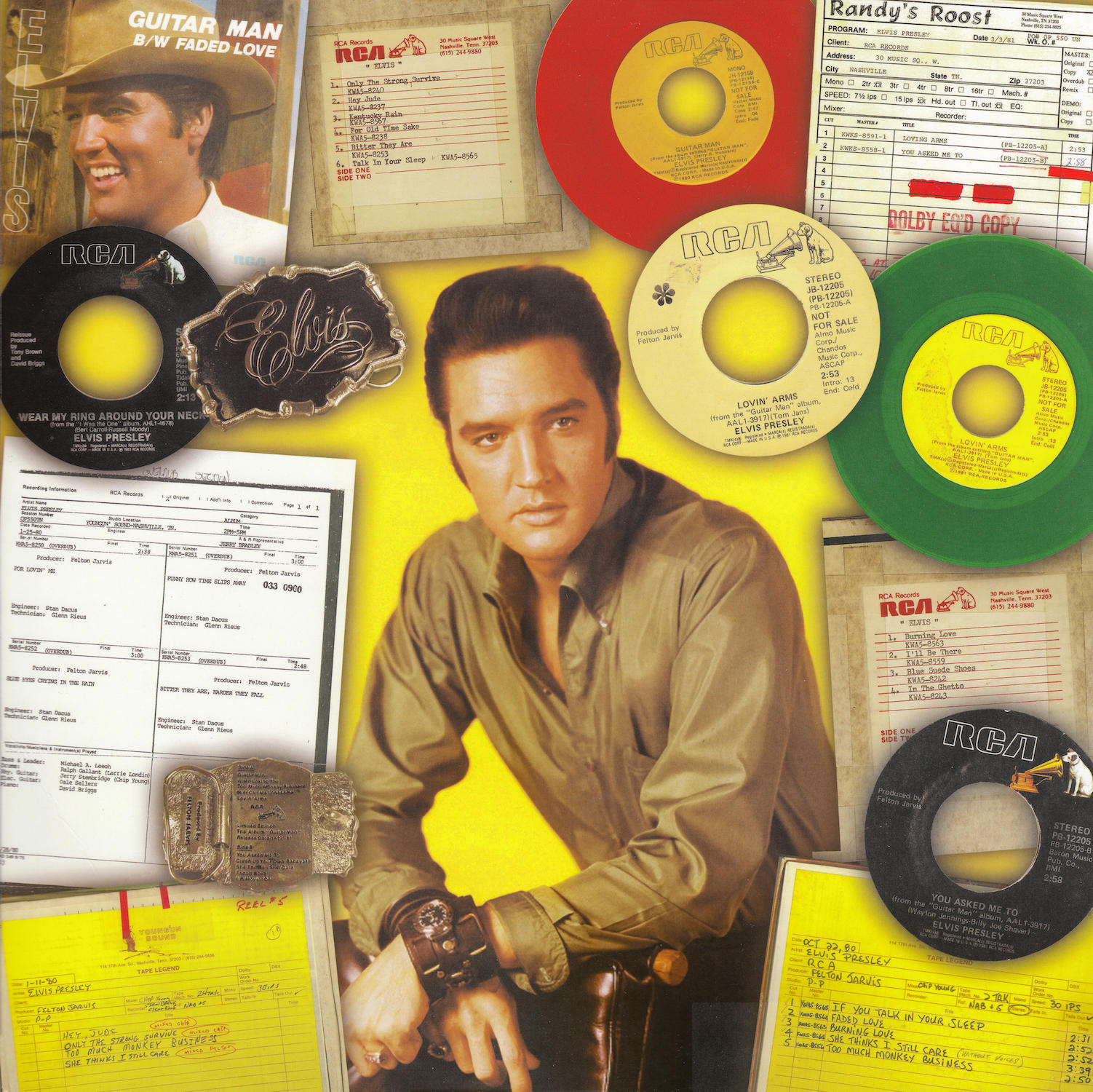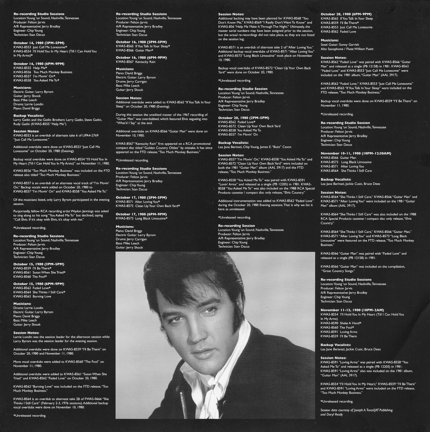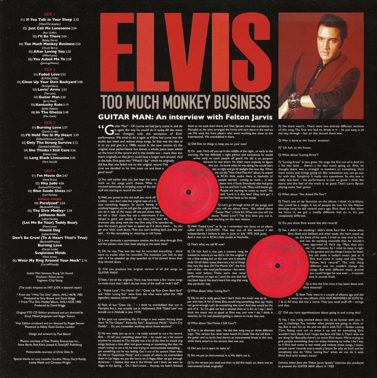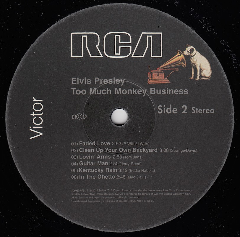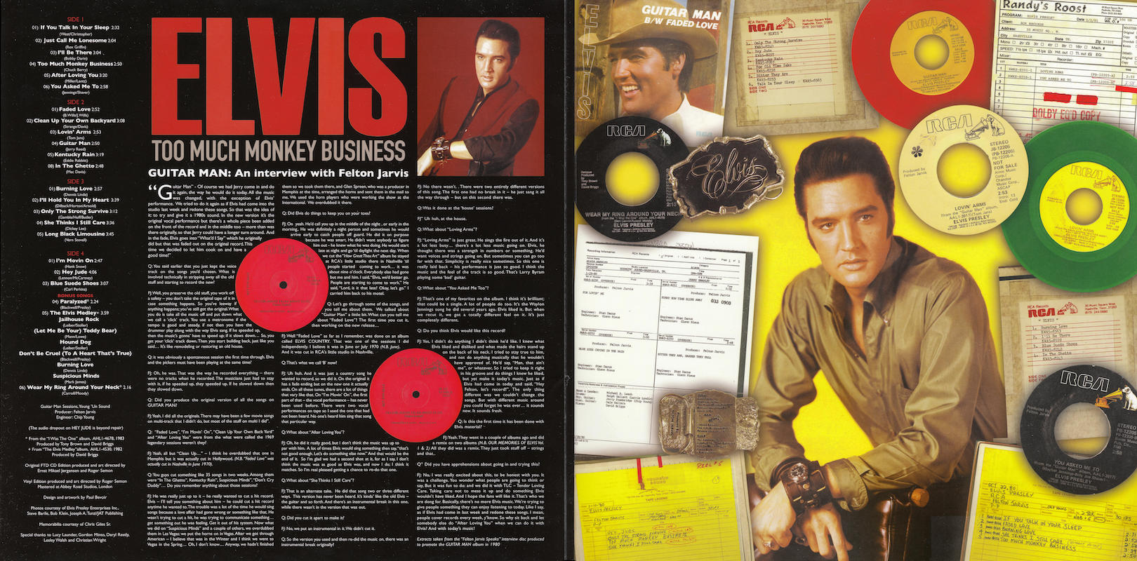 Too Much Monkey Business was first released by Follow That Dream as a 5 inch digipack CD in December 2000 (see here), and this vinyl edition uses all tracks from that CD, along with additional tracks from The Elvis Medley (1982) and I Was The One (1983) albums.