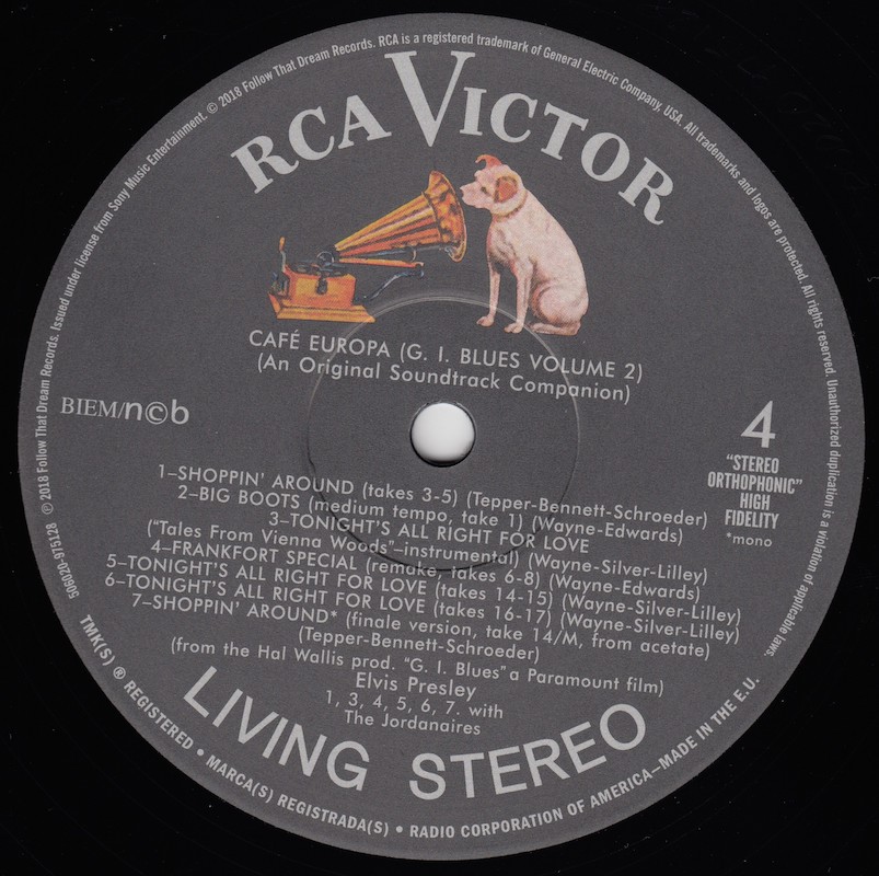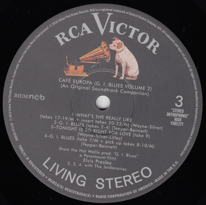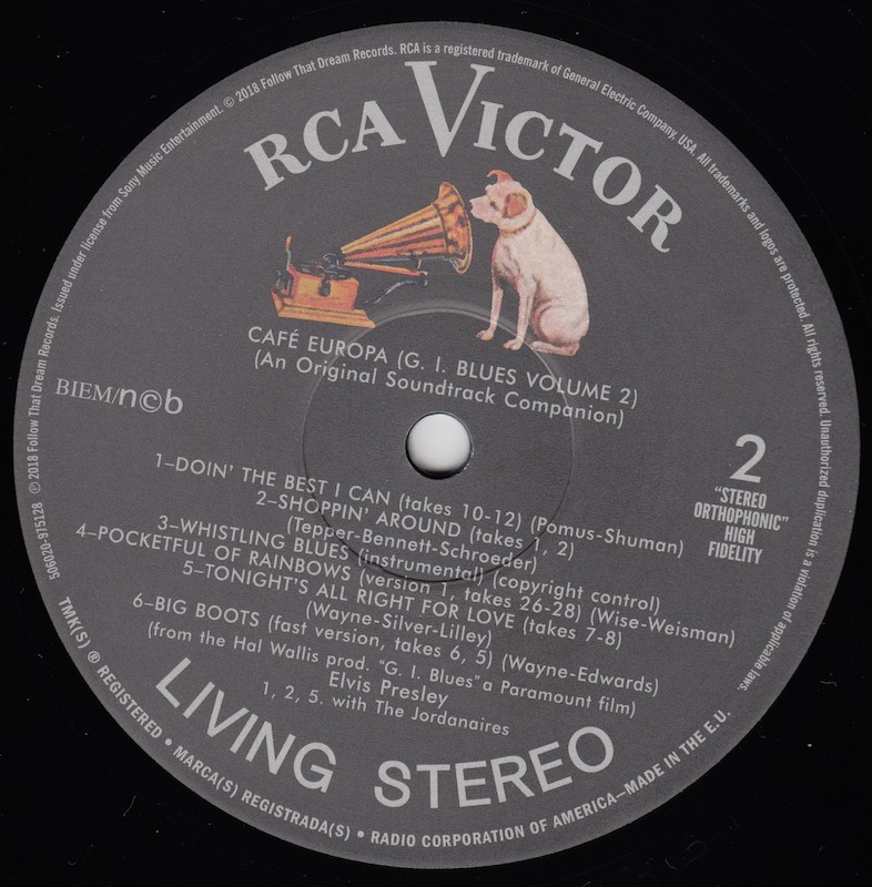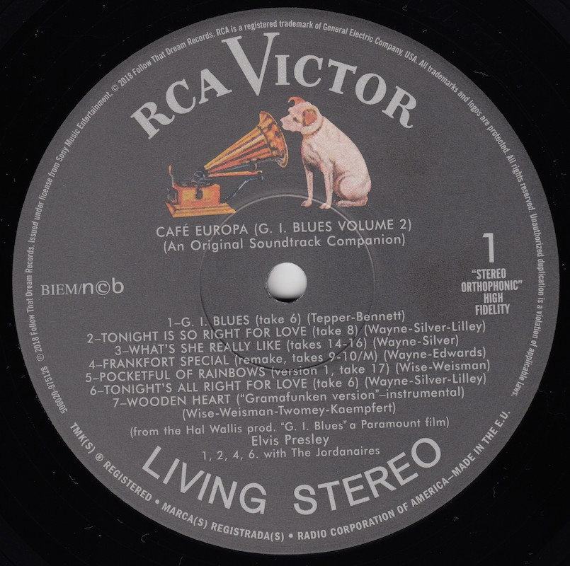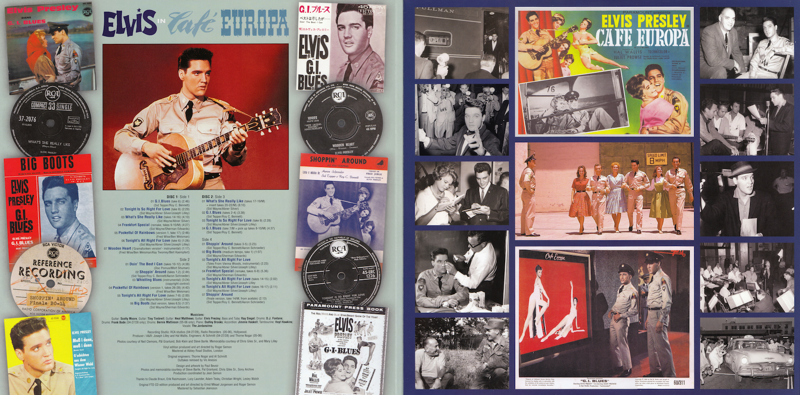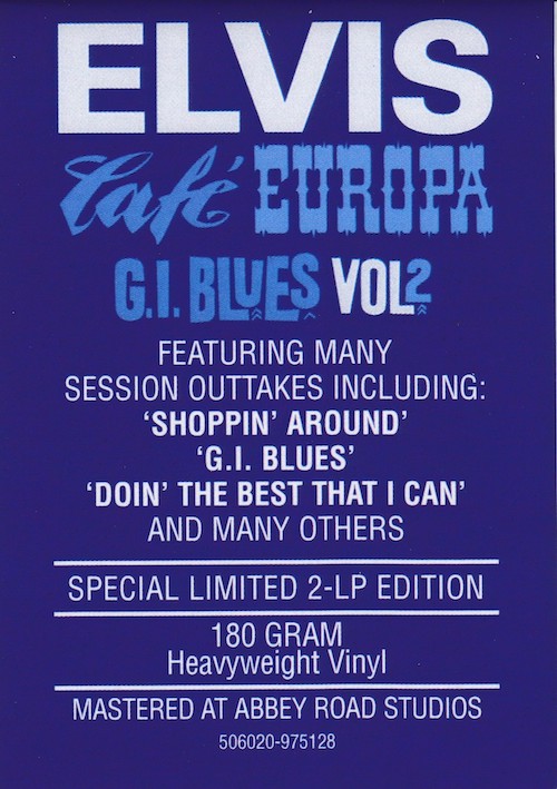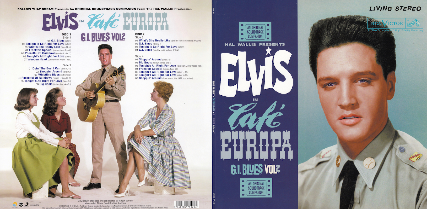 Café Europa : G.I. Blues Vol. 2 was first released by Follow That Dream as a 7 inch extended soundtrack in October 2013 (see here), and this vinyl edition is a compilation of tracks taken from that original release, apart from 'G.I. Blues takes 2, 3 and 4' (side 3, track 2) which was on the first volume of G.I. Blues (see here).
