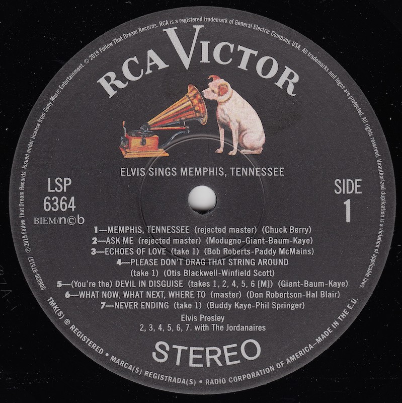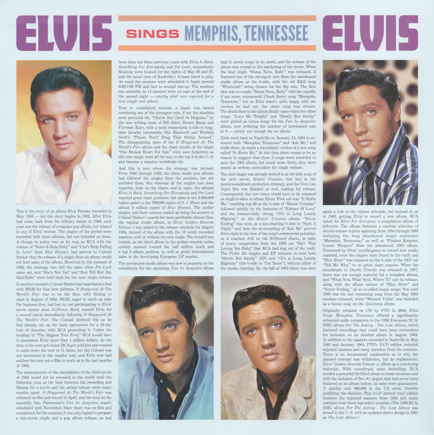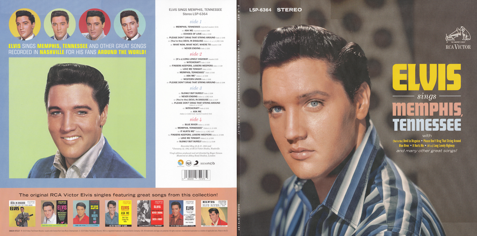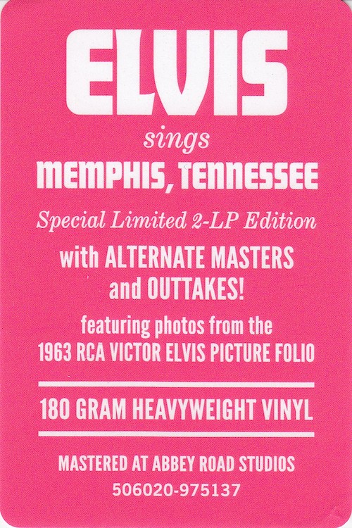 Elvis Sings Memphis, Tennessee was first released by Follow That Dream as a 7 inch 'Classic Album' format CD set in August 2008 (see here), and it was this set that the masters and outtakes on this vinyl edition are taken from.