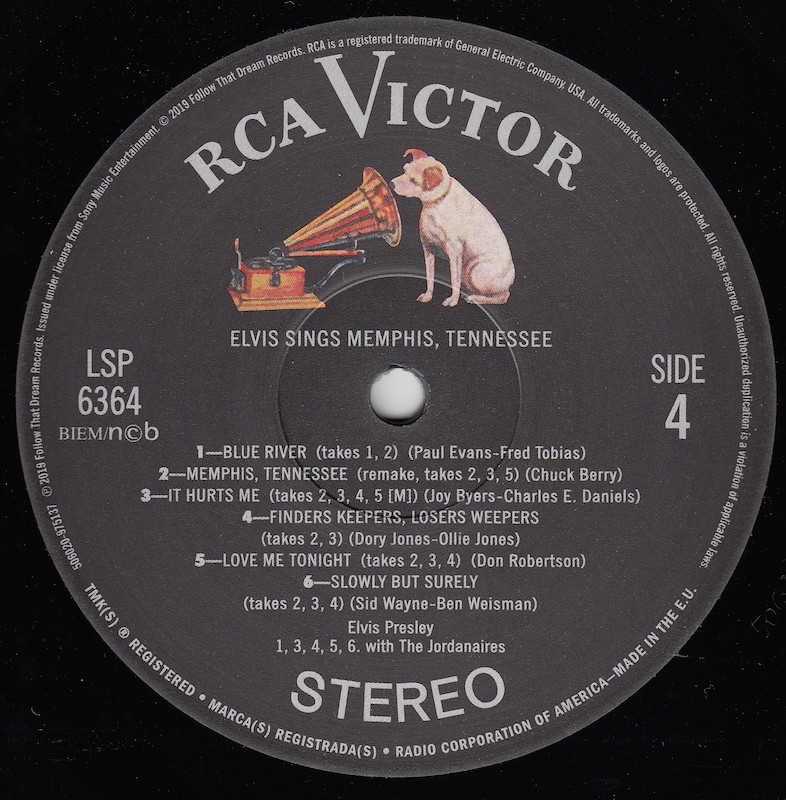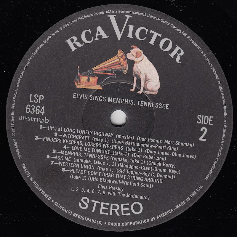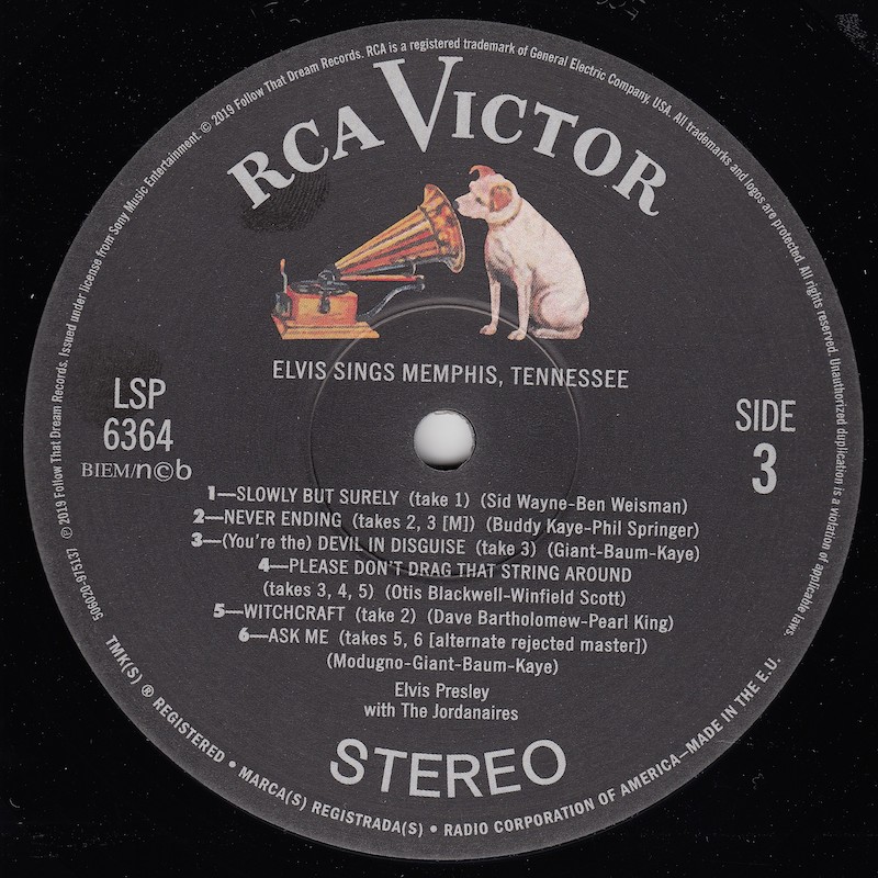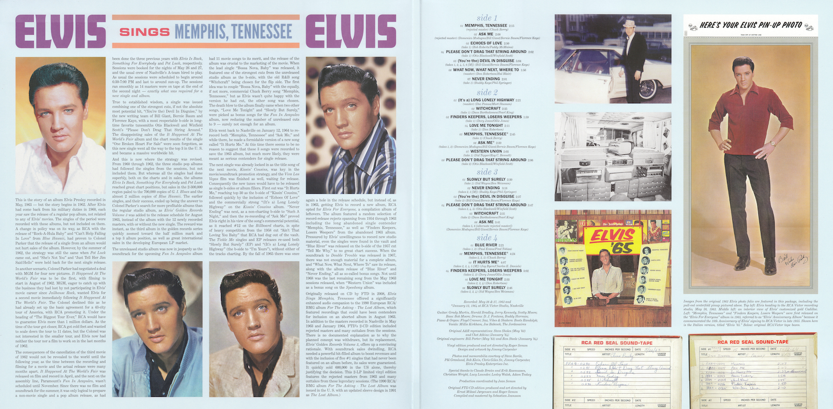 Elvis Sings Memphis, Tennessee was first released by Follow That Dream as a 7 inch 'Classic Album' format CD set in August 2008 (see here), and it was this set that the masters and outtakes on this vinyl edition are taken from.