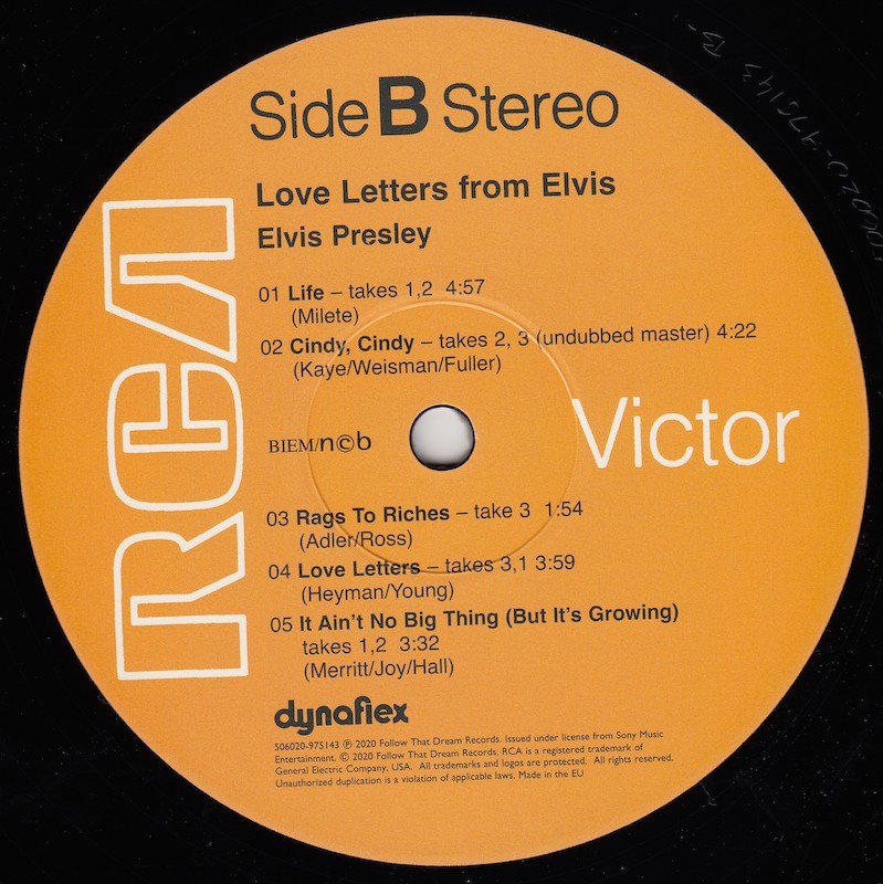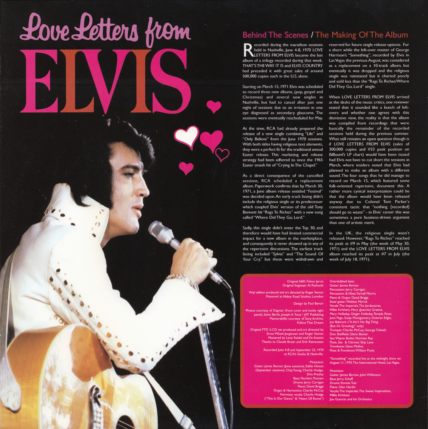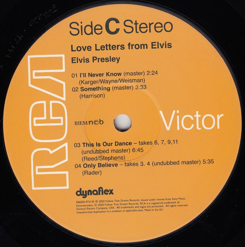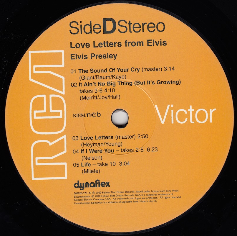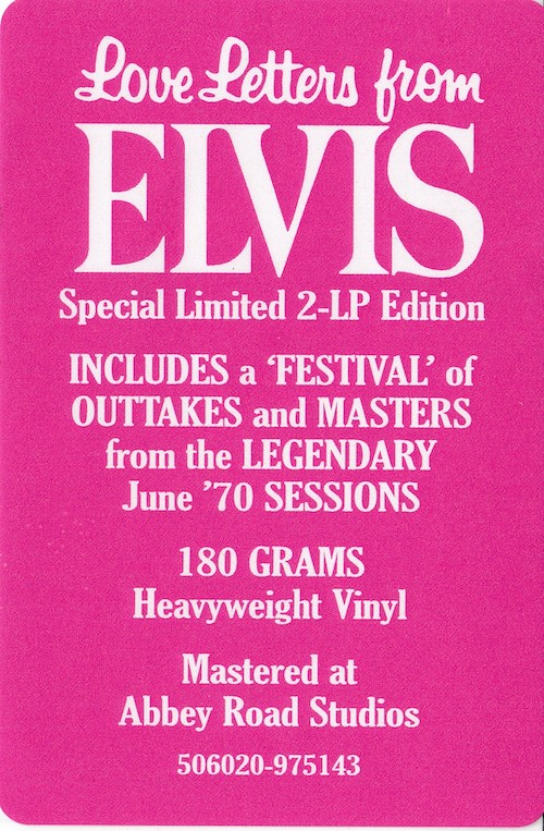 Love Letters From Elvis was first released by Follow That Dream as a 7 inch classic album in August 2008 (see here), and it was this set that all of the outtakes on this vinyl edition are taken from.