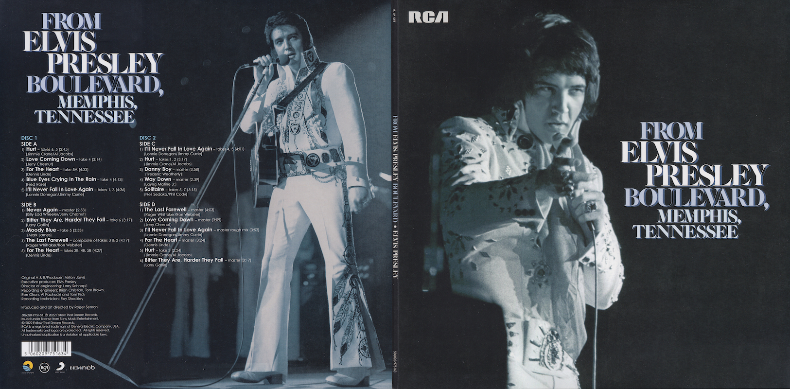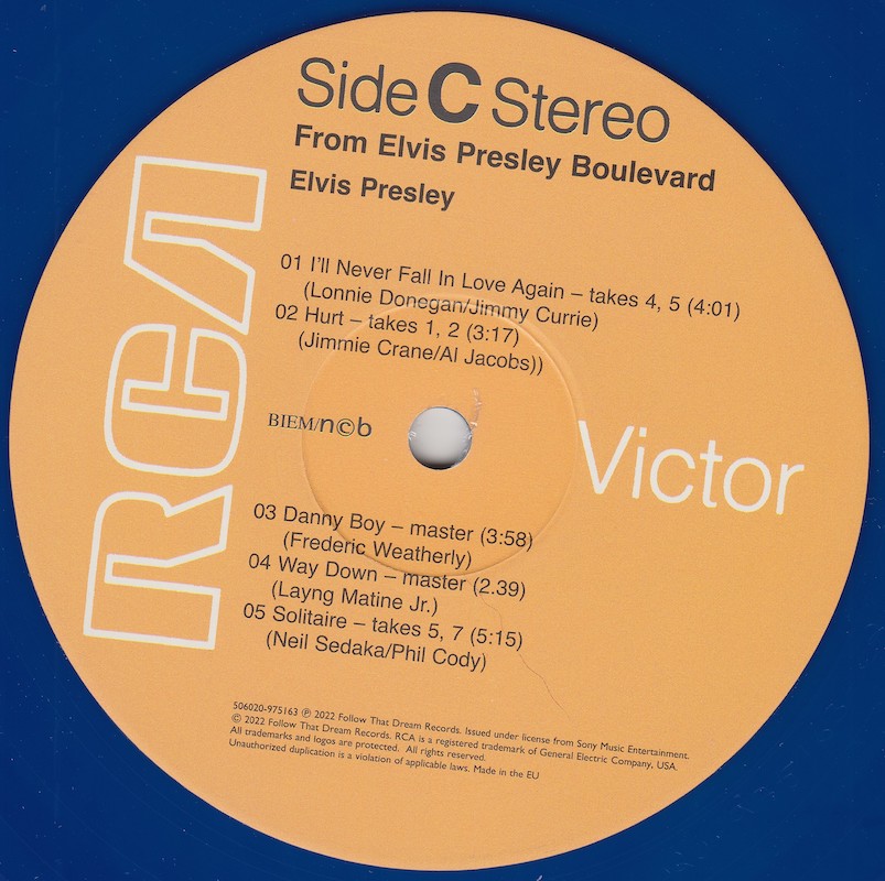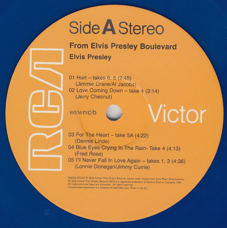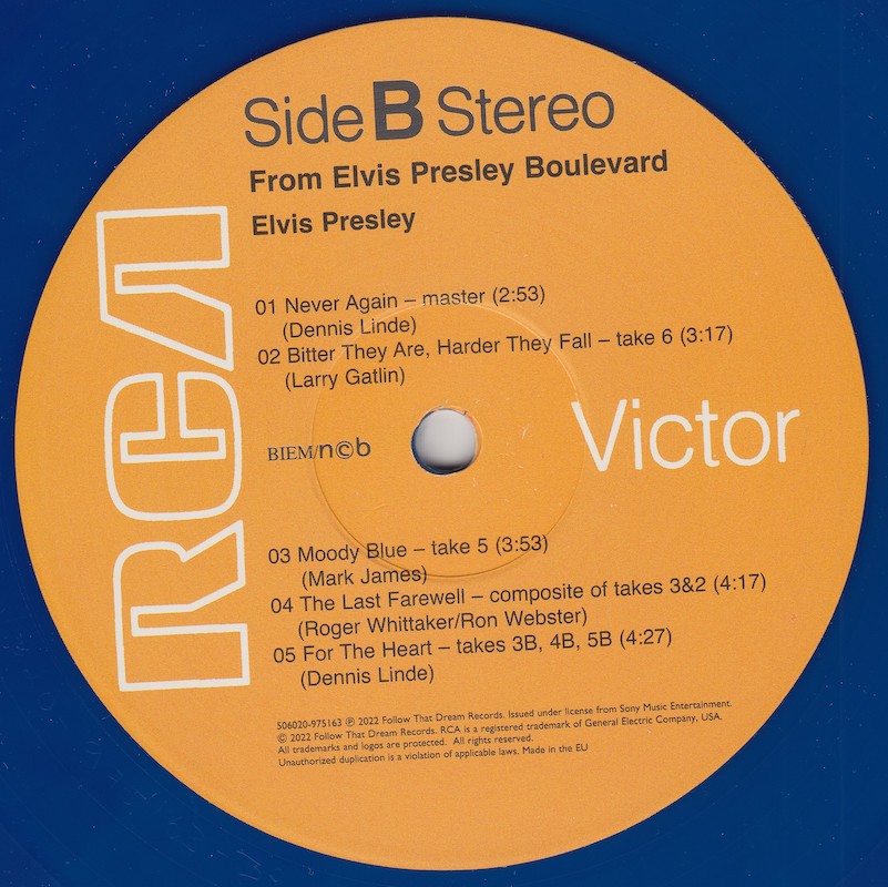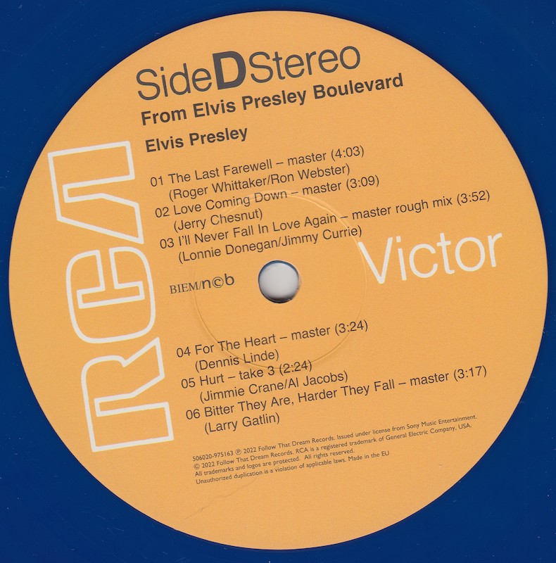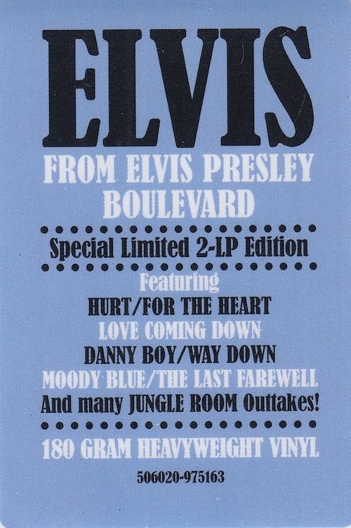 From Elvis Presley Boulevard, Memphis, Tennessee was first released by Follow That Dream as a 7 inch classic album in October 2012 (see here), and it was this set that the outtakes on this vinyl edition are taken from, as well as 'Moody Blue' (side B, track 3) and 'Way Down' (side C, track 4) being taken from FTD's Moody Blue classic album (see here).