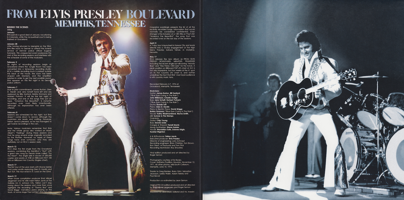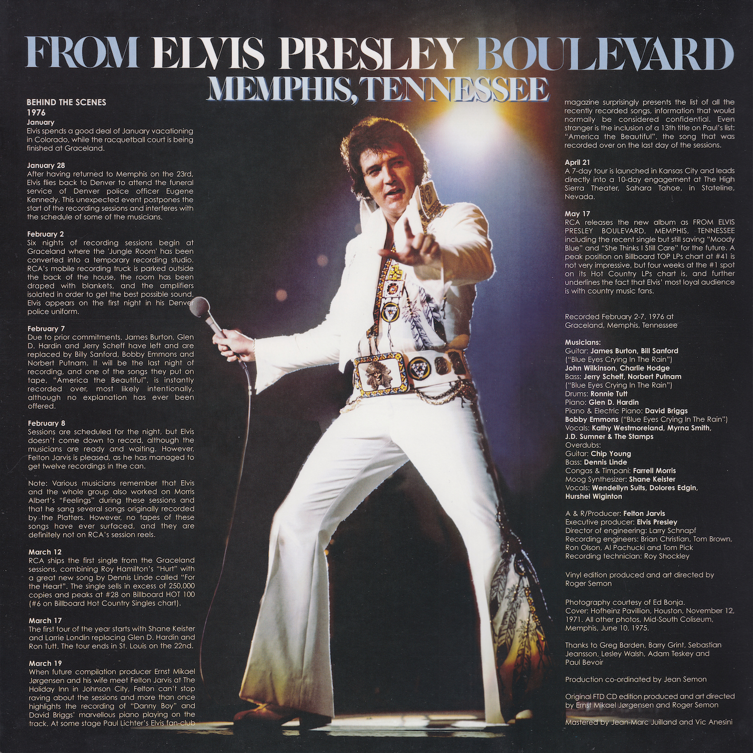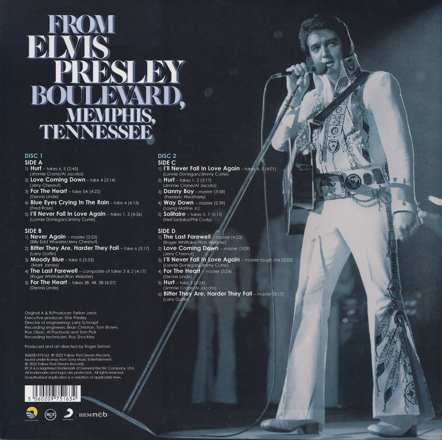 From Elvis Presley Boulevard, Memphis, Tennessee was first released by Follow That Dream as a 7 inch classic album in October 2012 (see here), and it was this set that the outtakes on this vinyl edition are taken from, as well as 'Moody Blue' (side B, track 3) and 'Way Down' (side C, track 4) being taken from FTD's Moody Blue classic album (see here).