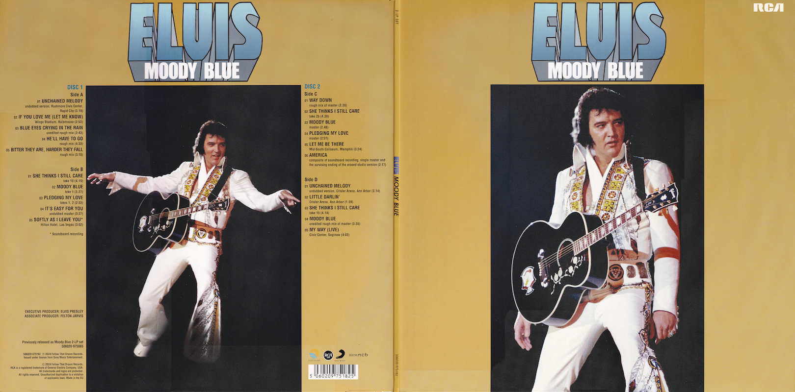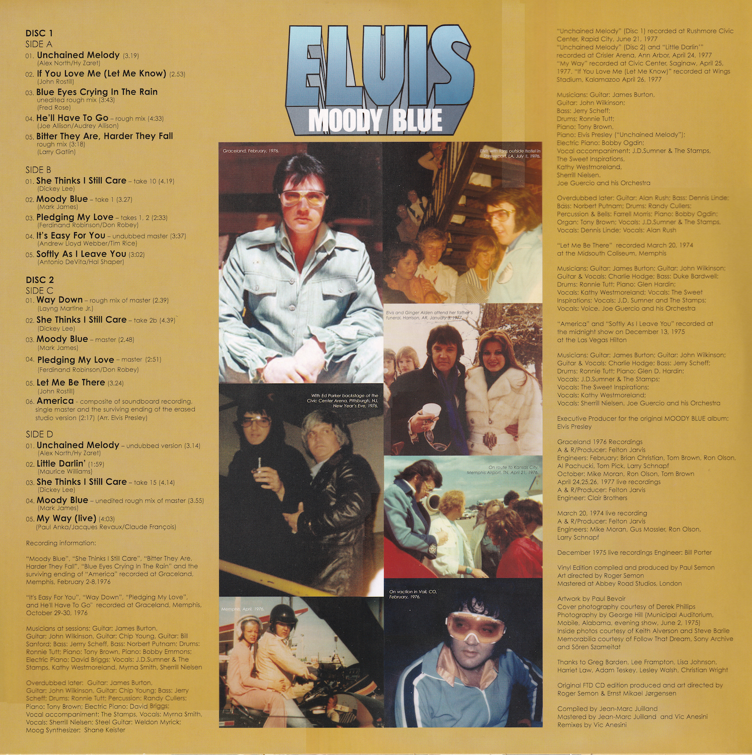 That version of 'Unchained Melody' (side 1, track 1) is not the same live performance that was on the original Moody Blue album, which was from April 24 1977, in Ann Arbor. This version is from June 21 1977, in Rapid City, and this undubbed version is taken from the 1990 album The Great Performances. The overdubbed version from June 21 1977 was released as a single in February 1978.