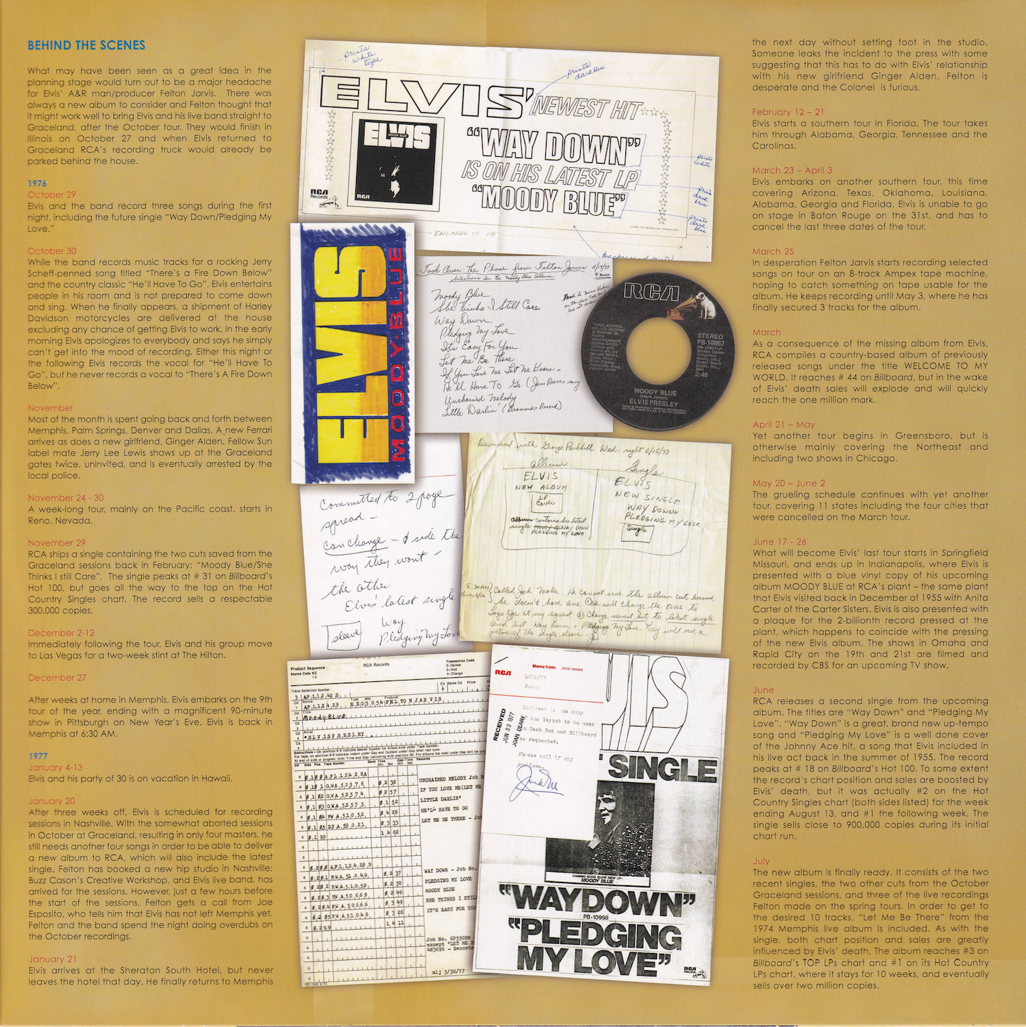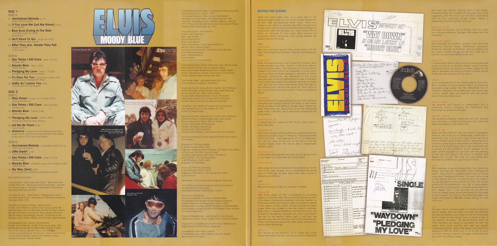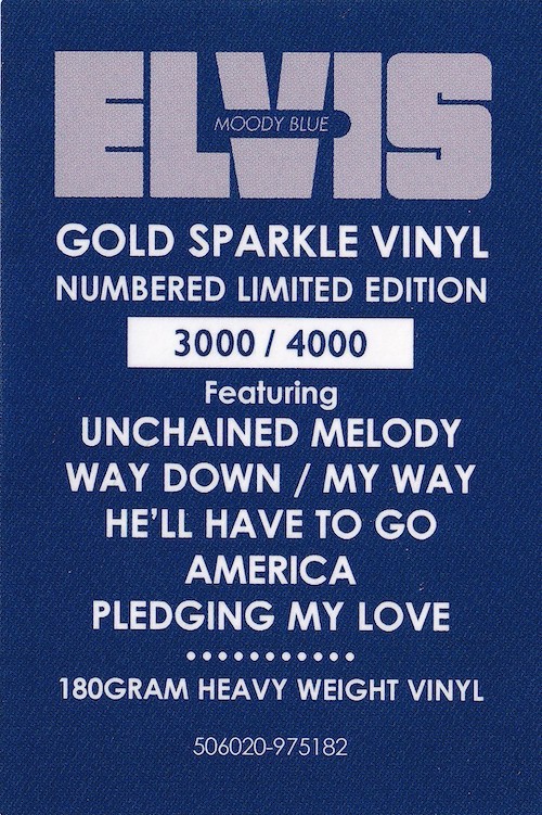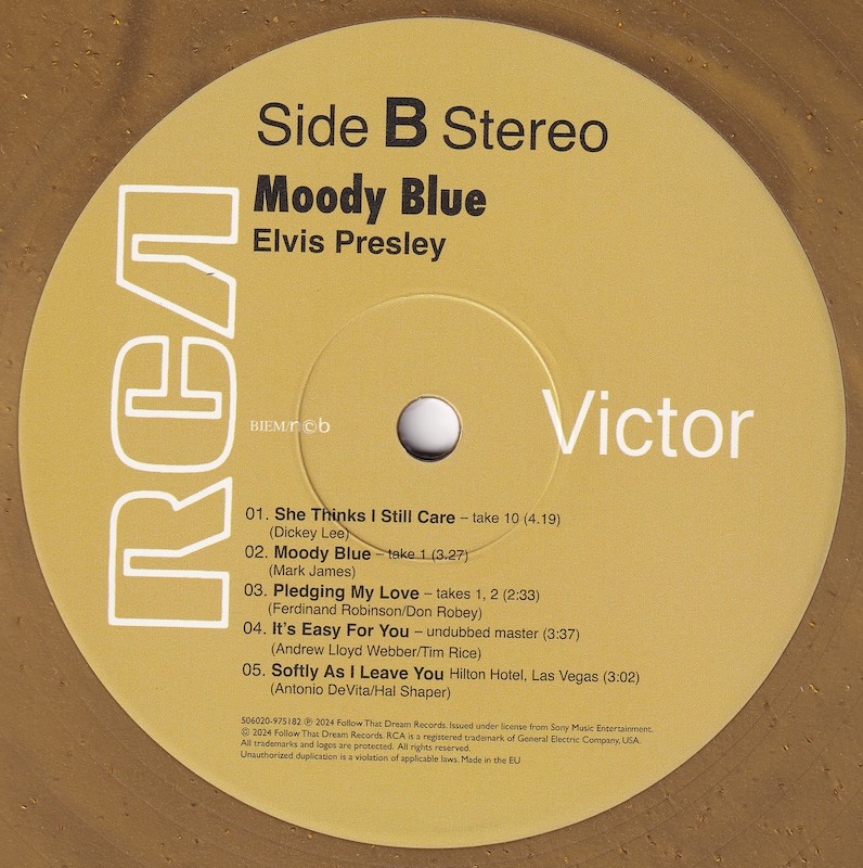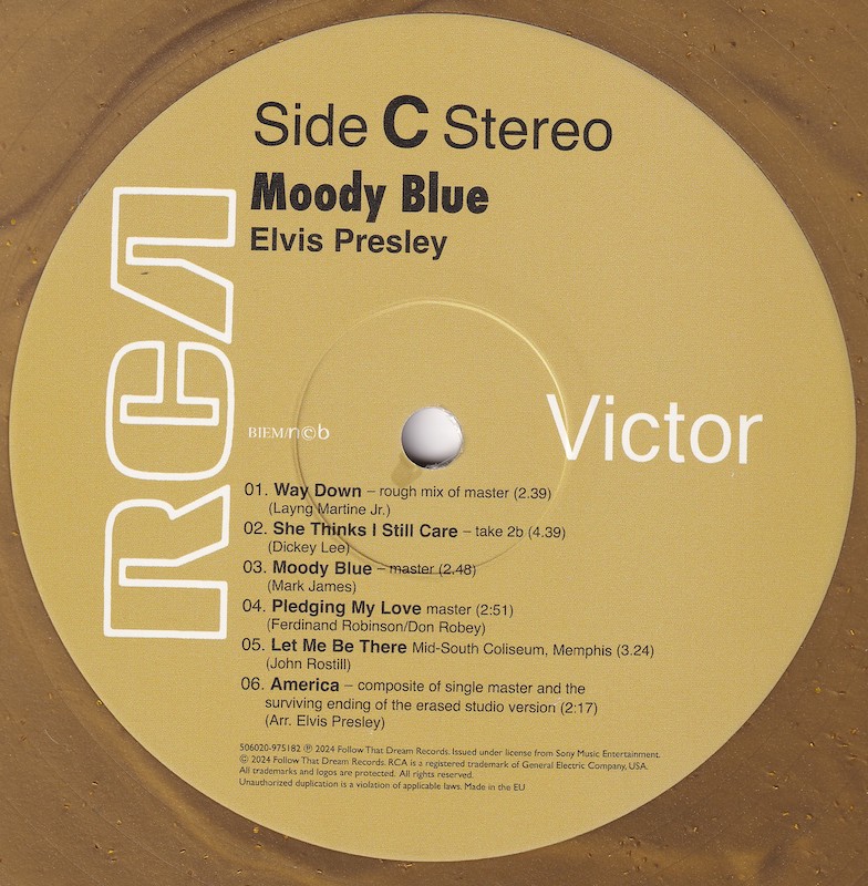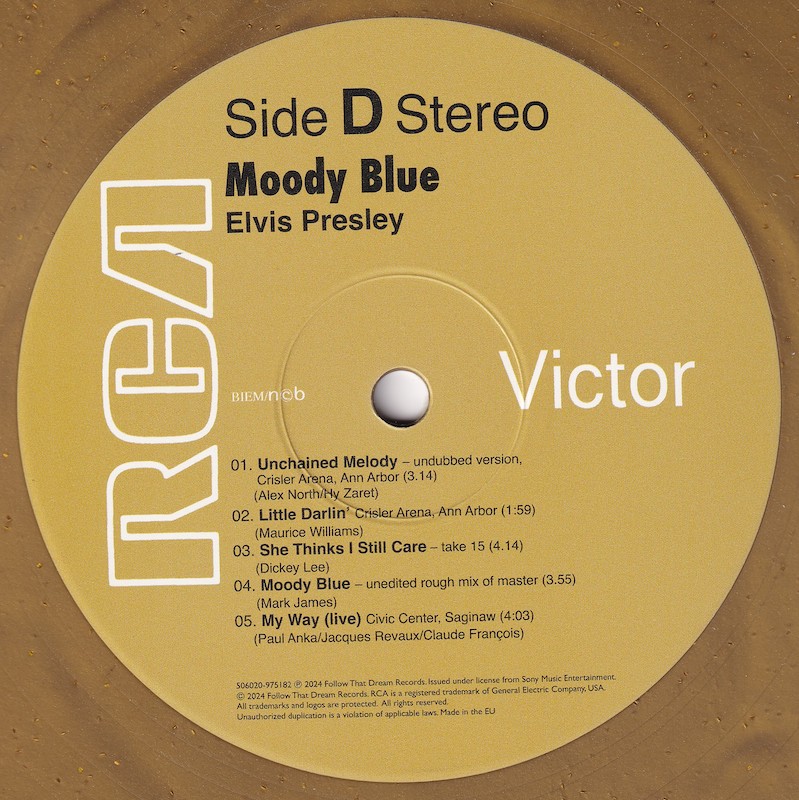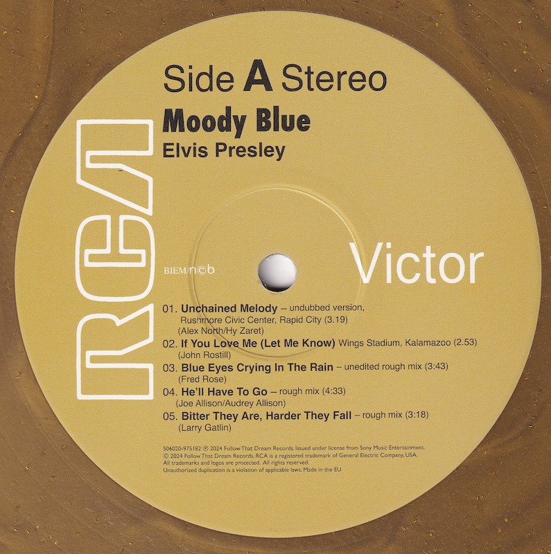 Moody Blue was first released by Follow That Dream as a 7 inch classic album in December 2013 (see here), and this vinyl edition is a compilation of tracks taken from that original release, apart from the undubbed single master of 'Unchained Melody' (side 1, track 1).