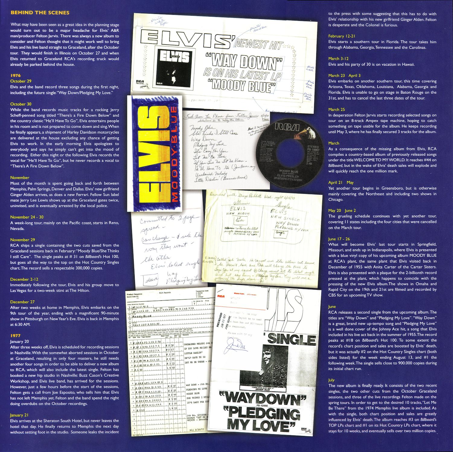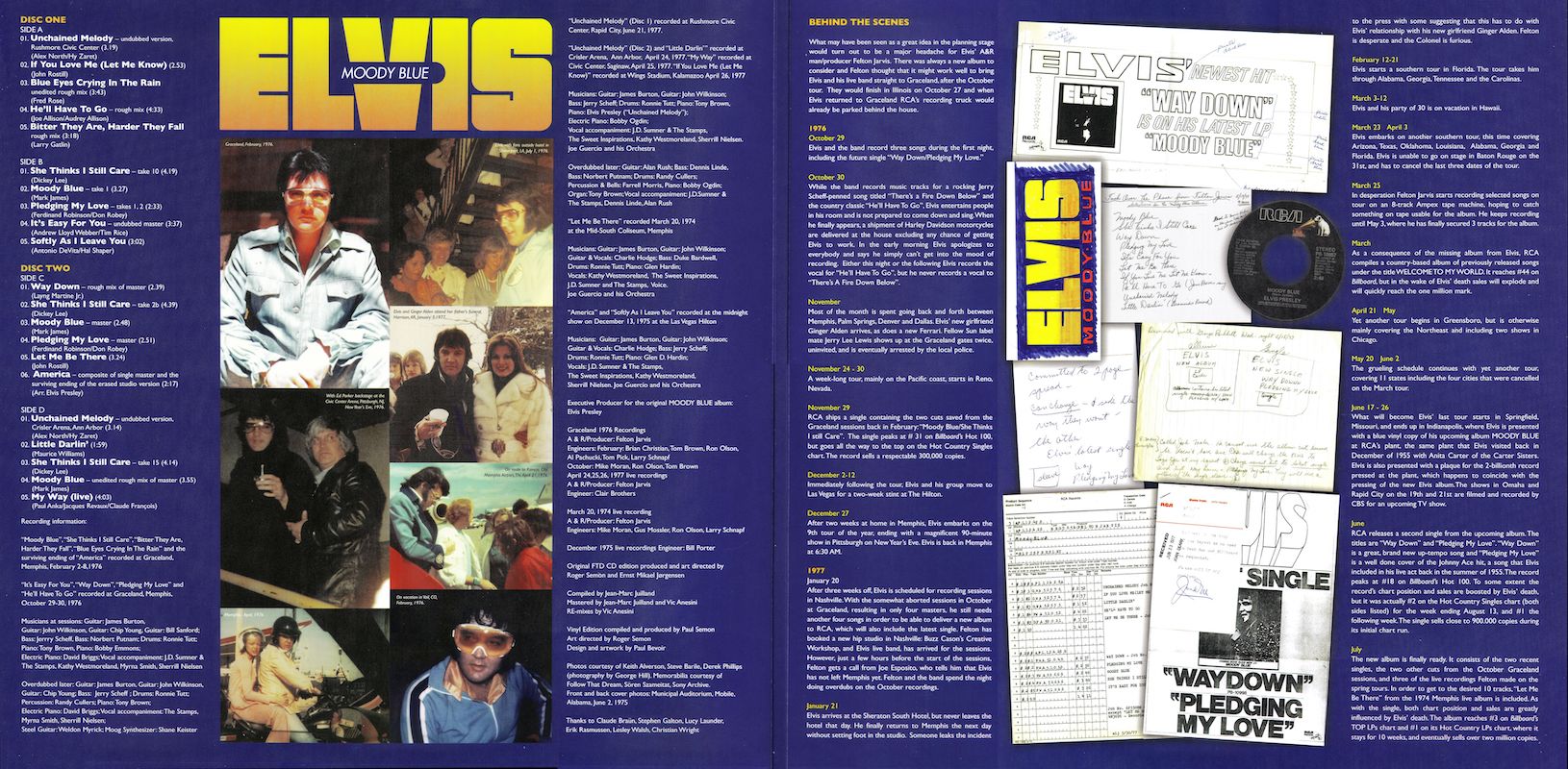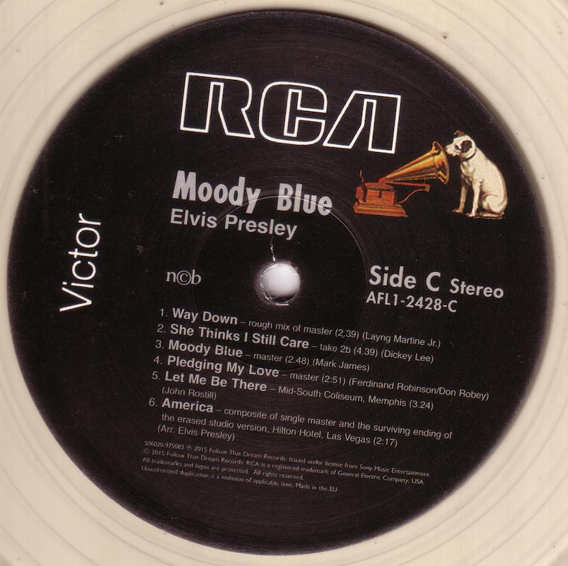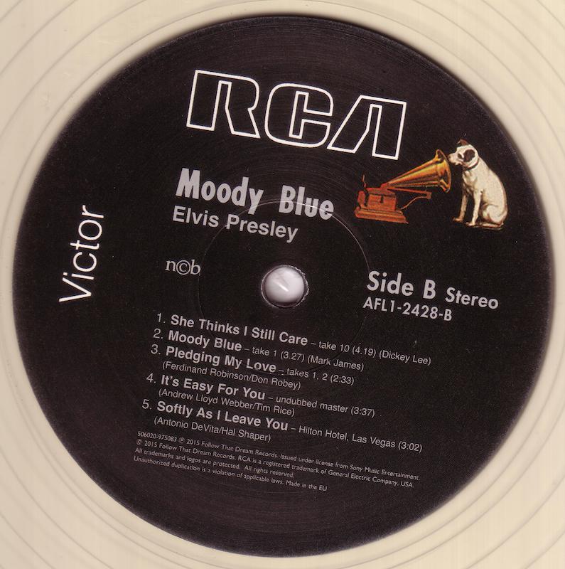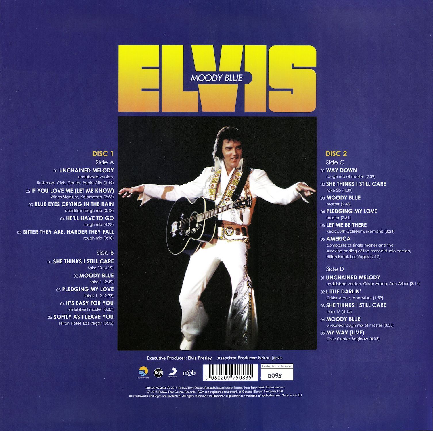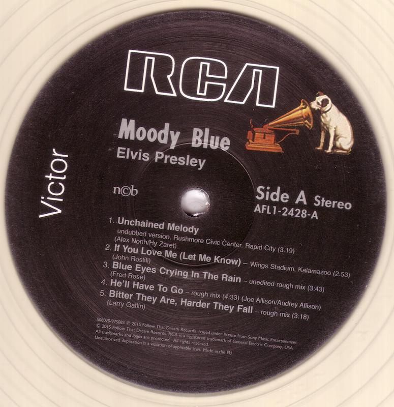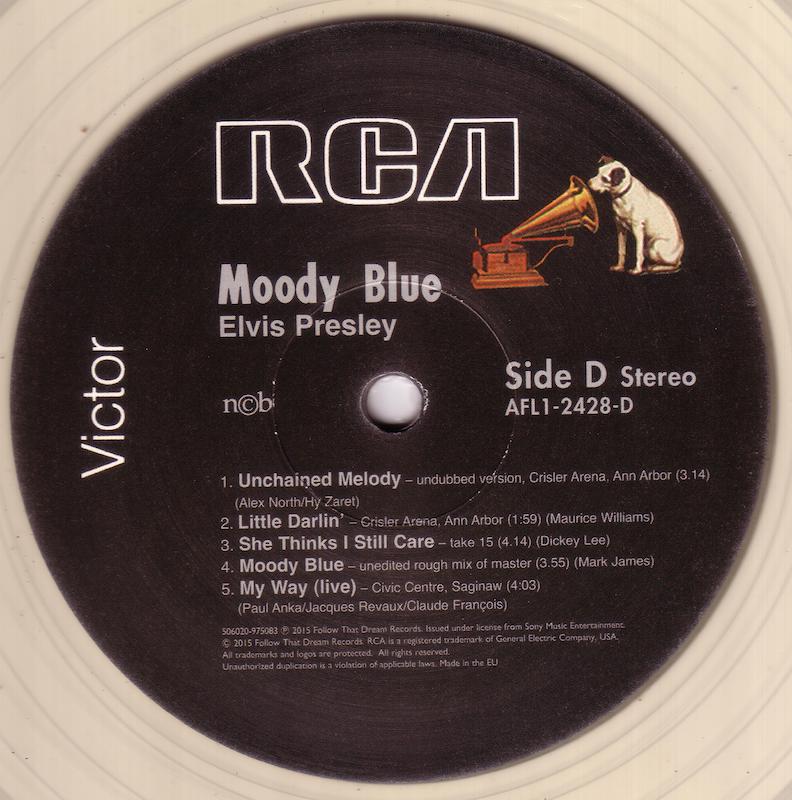Moody Blue was first released by Follow That Dream as a 7 inch classic album in December 2013 (see here), and this vinyl edition is a compilation of tracks taken from that original release, apart from the undubbed single master of 'Unchained Melody' (side 1, track 1).