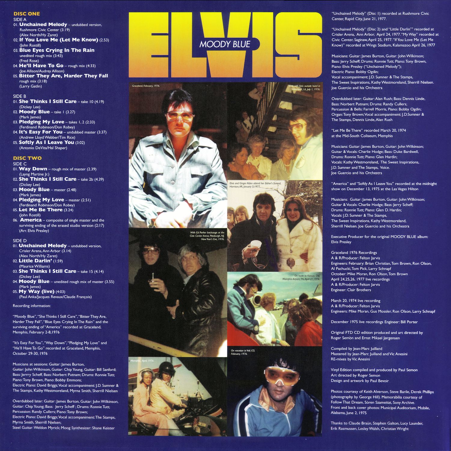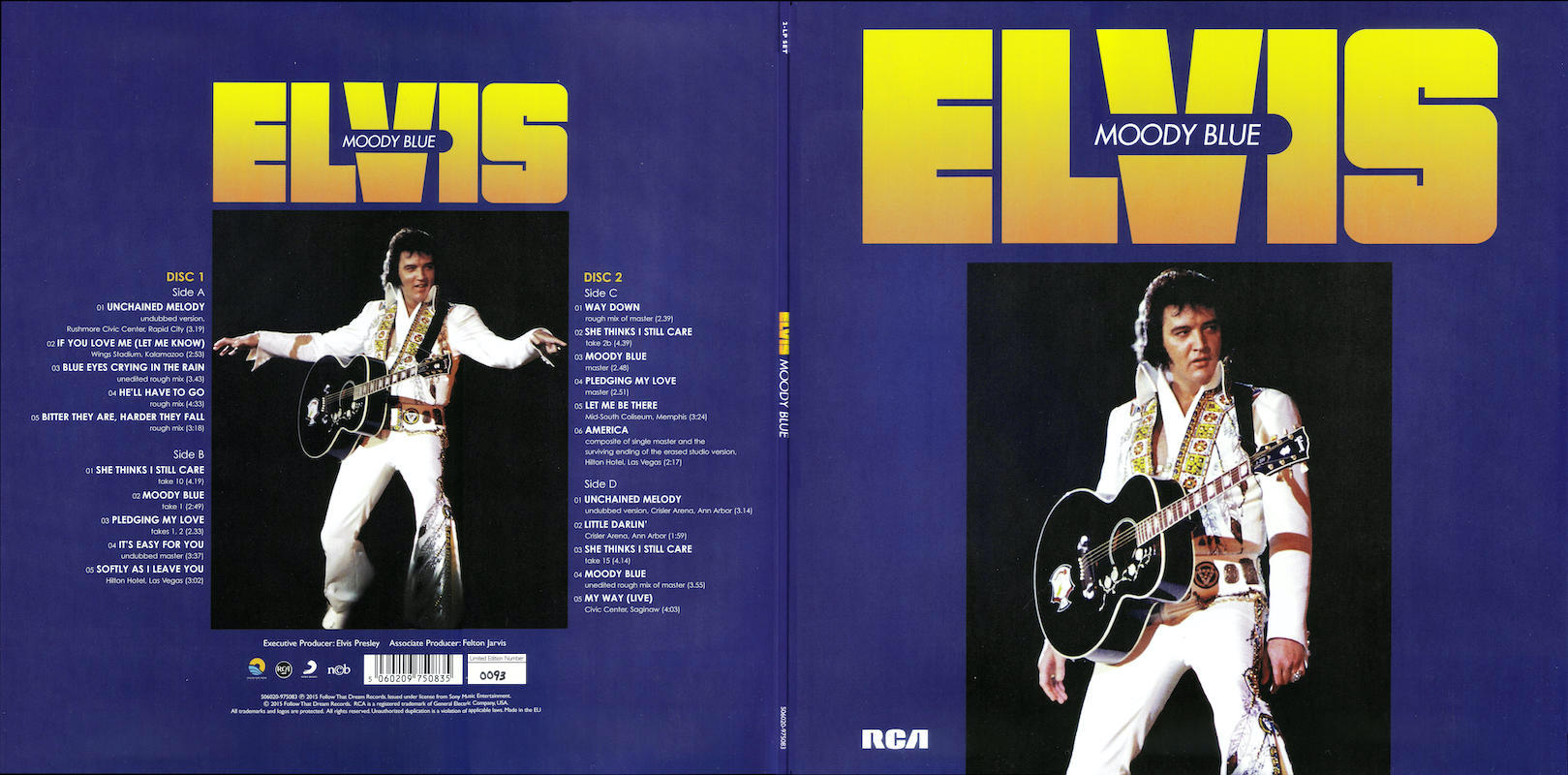 That version of 'Unchained Melody' (side 1, track 1) is not the same live performance that was on the original Moody Blue album, which was from April 24 1977, in Ann Arbor. This version is from June 21 1977, in Rapid City, and this undubbed version is taken from the 1990 album The Great Performances. The overdubbed version from June 21 1977 was released as a single in February 1978.