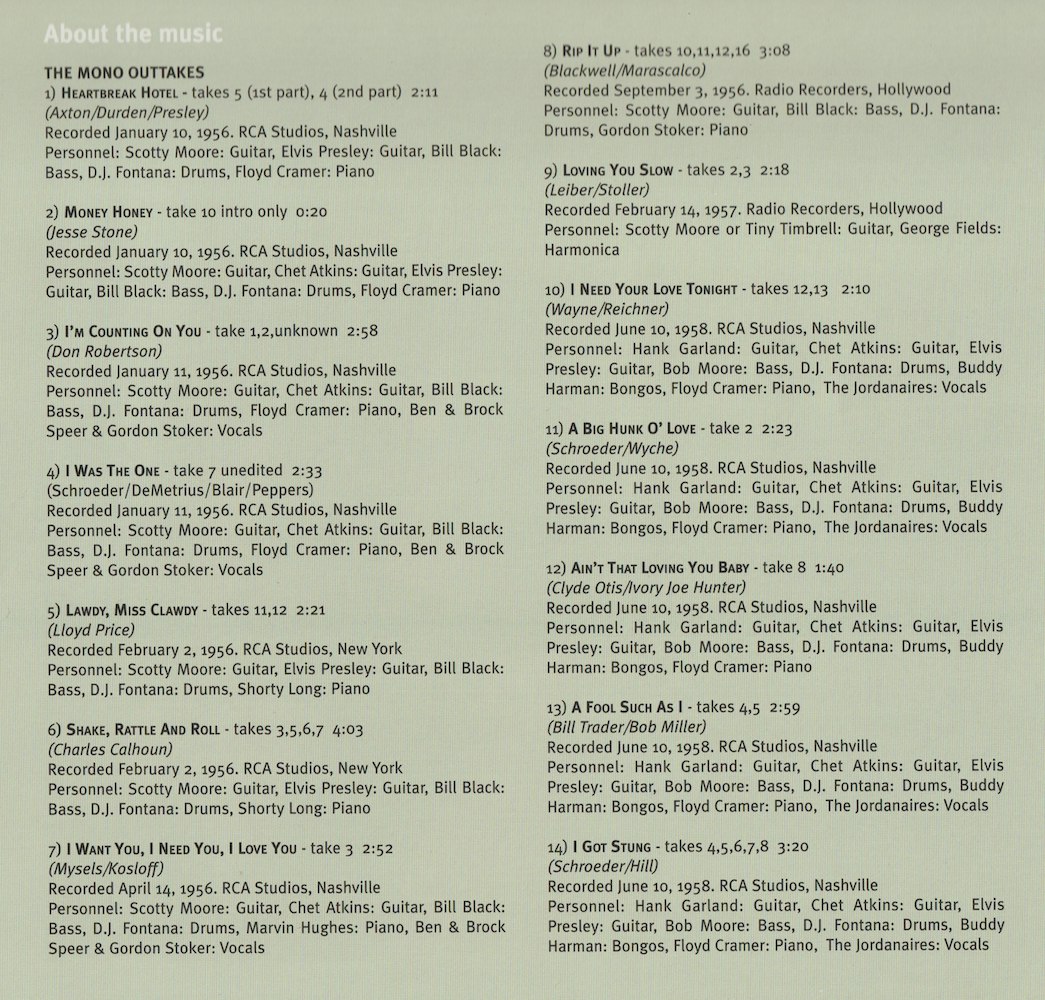 Takes 1 and 2 of 'I'm Counting On You' (track 3) are listed in the book but it's actually takes 1a and 1b that appear on the CD. The real "Take 2" was released on the FTD classic album of Elvis Presley in July 2006 (see here).