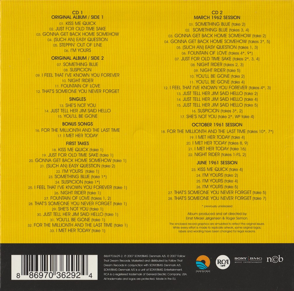The second pressing of this set, released in 2012, can be distinguished from the original pressing by the matrix number printed on the silver side of the CDs. On the first pressing it has "FTD 68-1" and "FTD 68-2", but the second pressing has the catalogue number "88697 06329-2" printed instead, even though it's a mistake as the actual number should be "88697 03629-2"!