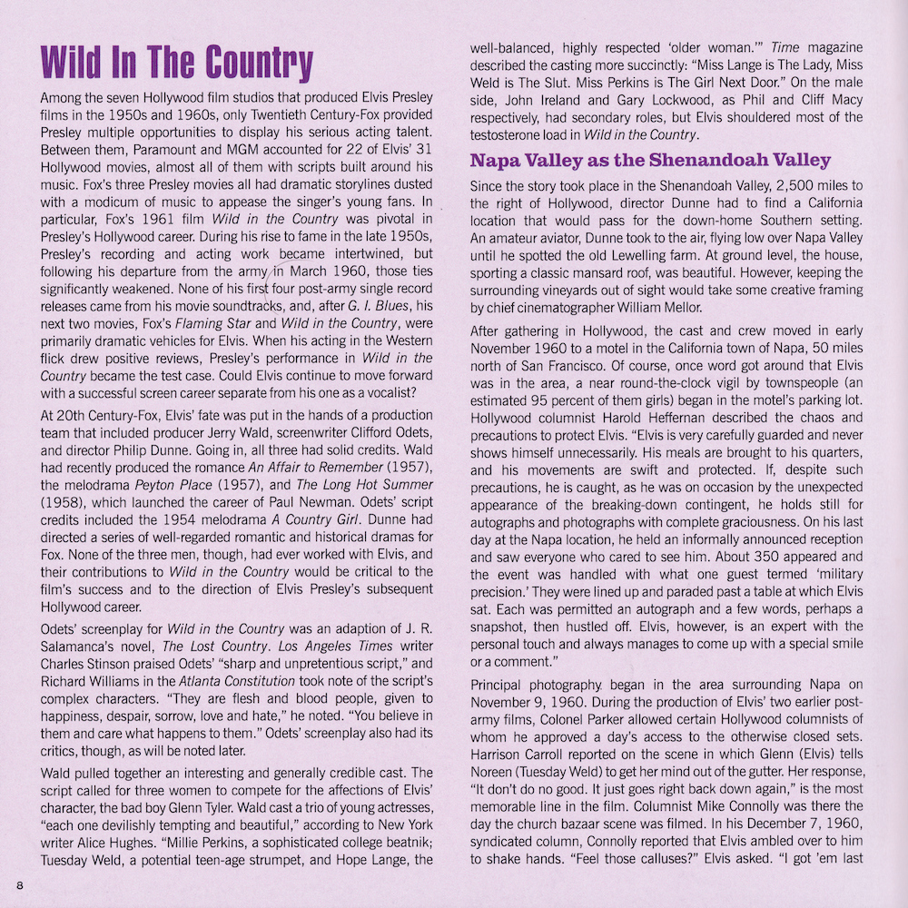 | Deluxe Sessions Package, with four CDs containing RCA's March 1961 recording sessions, and the November 1960 recording sessions for the 20th Century Fox picture Wild In The Country. |
