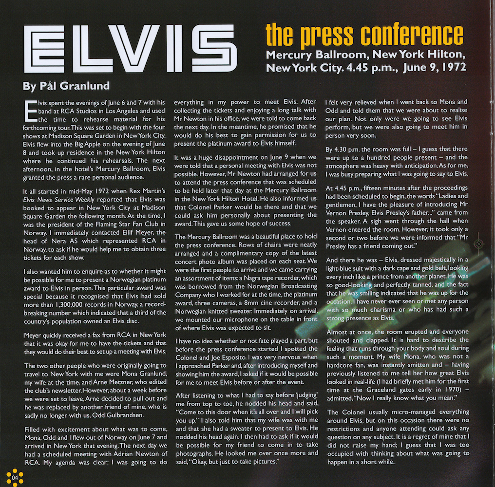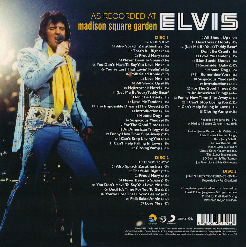 This 50th Anniversary FTD 8" Deluxe edition celebrates two legendary shows from June 10 1972 with newly mixed versions of both shows by Memphian recording engineer Matt-Ross Spang. Disc 3 features the complete original press conference recorded at the New York Hilton, on June 9.